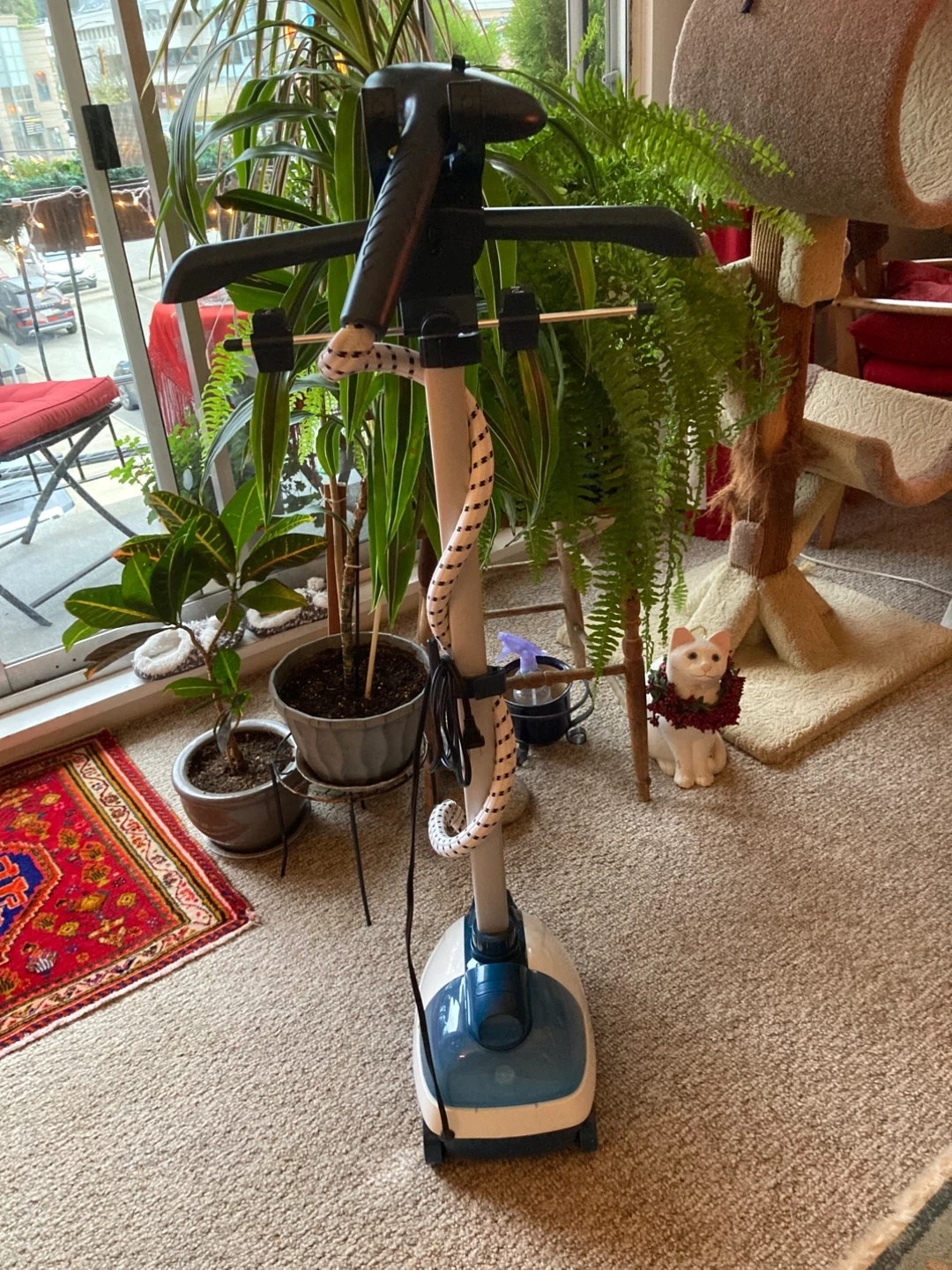 This is a garment steamer with a blue and white base. It includes a hanger attachment and a flexible hose. It's perfect for quickly refreshing clothes. Used two times only, and brand new. My son has no room for it in his new place.