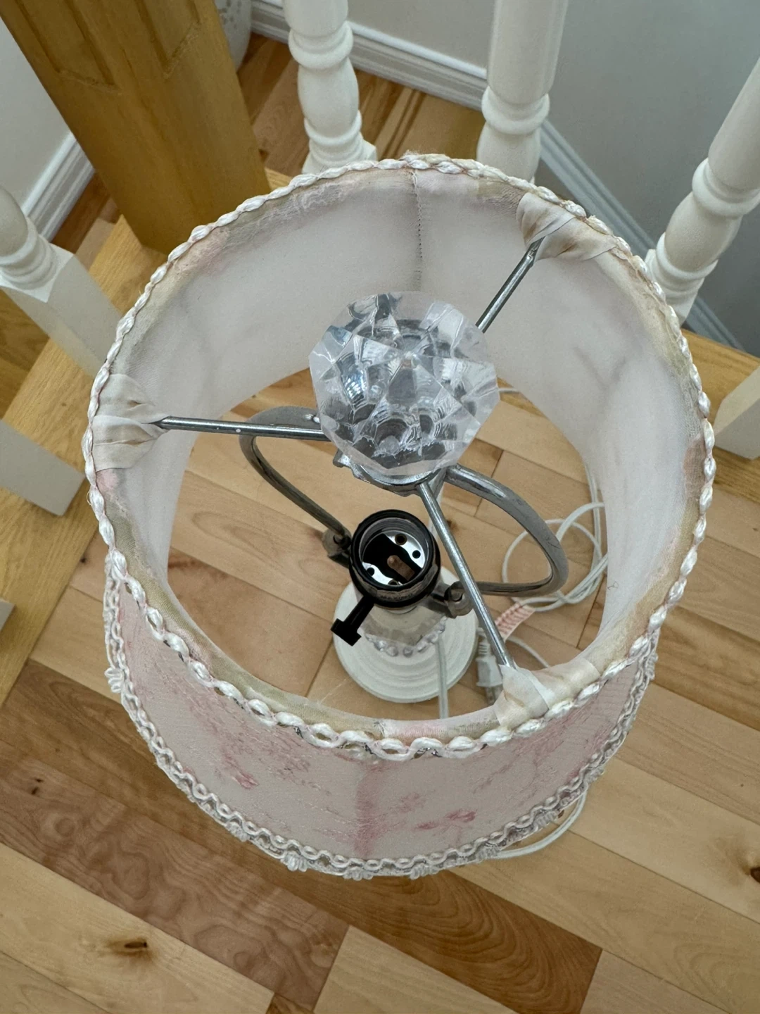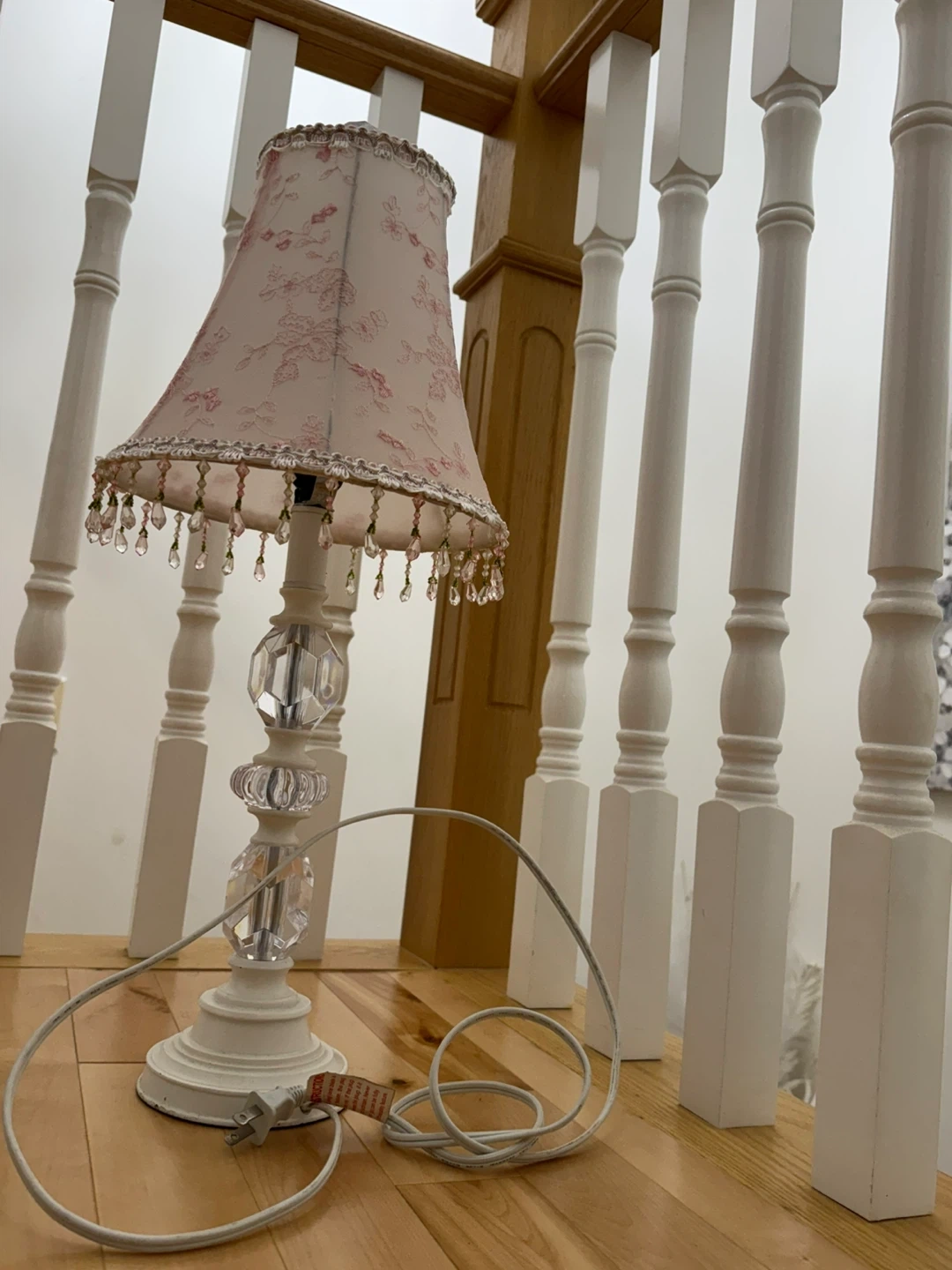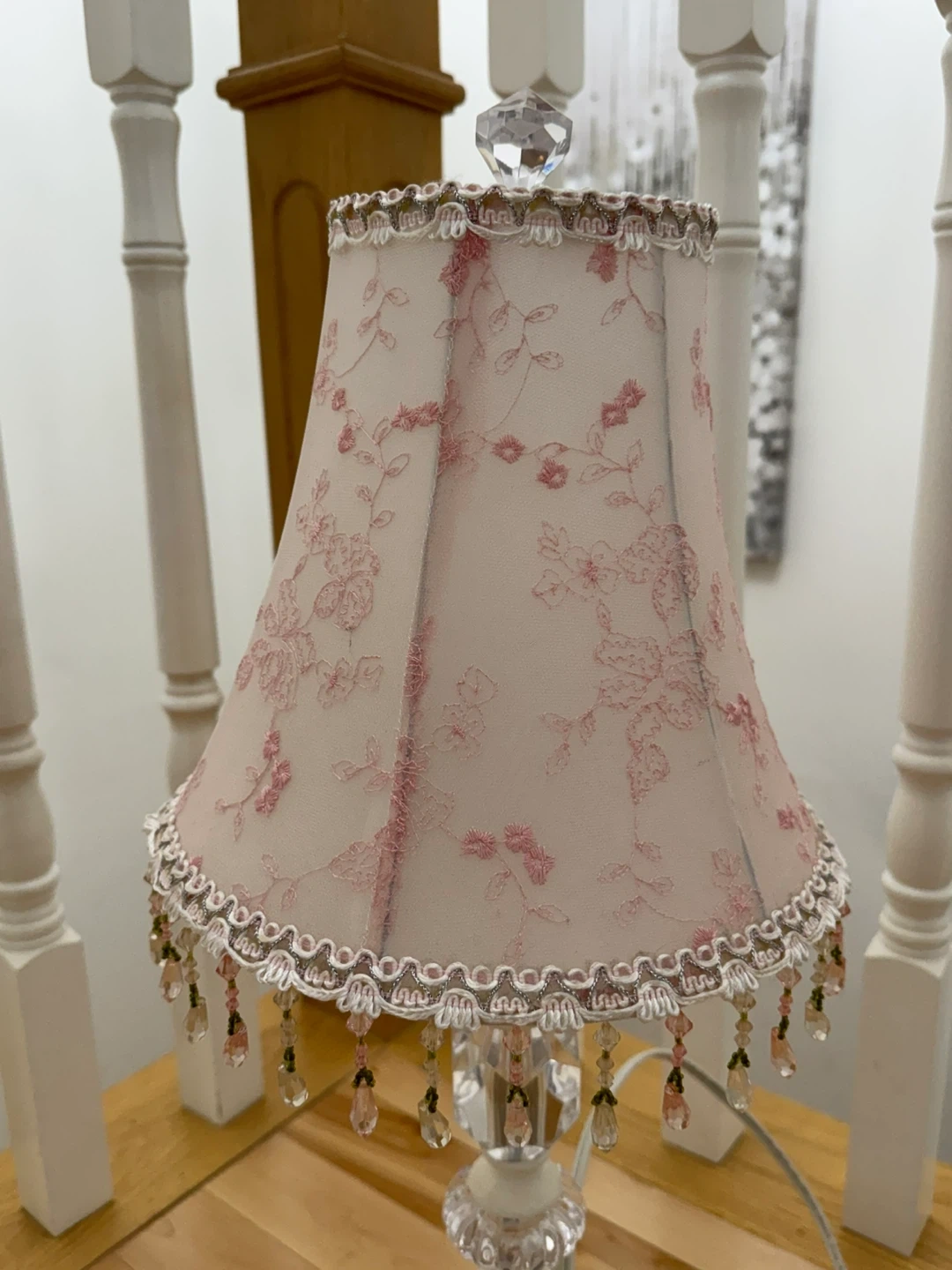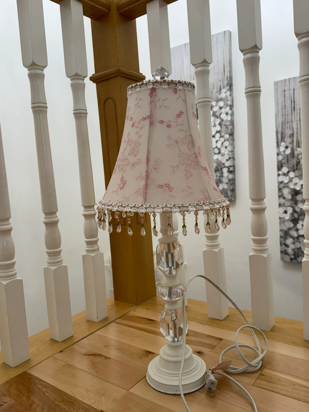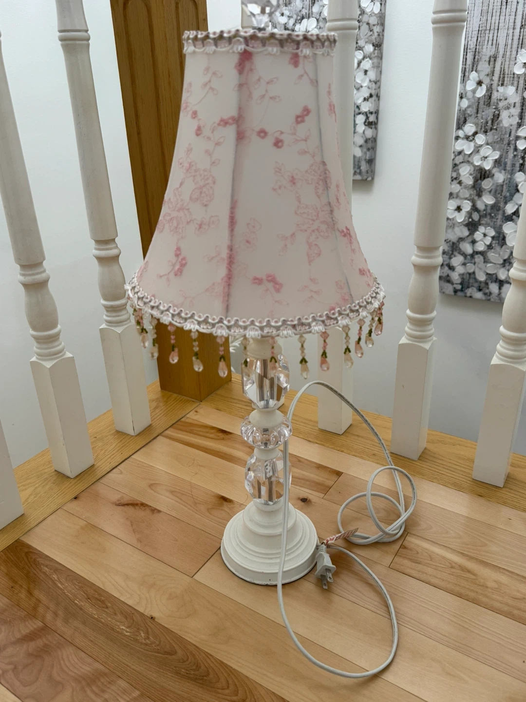 Beautiful pink and white lamp. Detailed pink flowers included on lamp shade. Bulb not included.