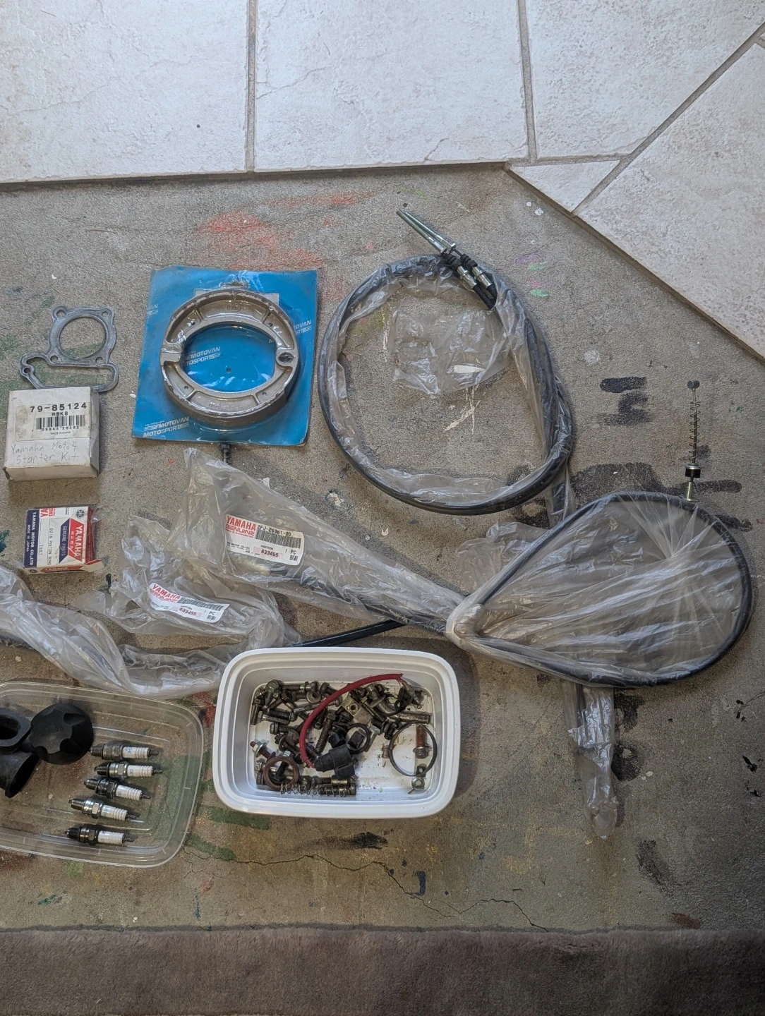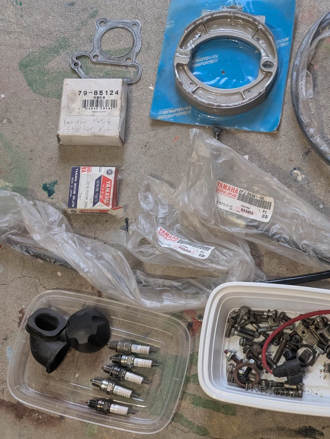 A collection of Yamaha motorcycle parts, including a starter kit and various components still in their original packaging. Great for repairs or restoration projects!