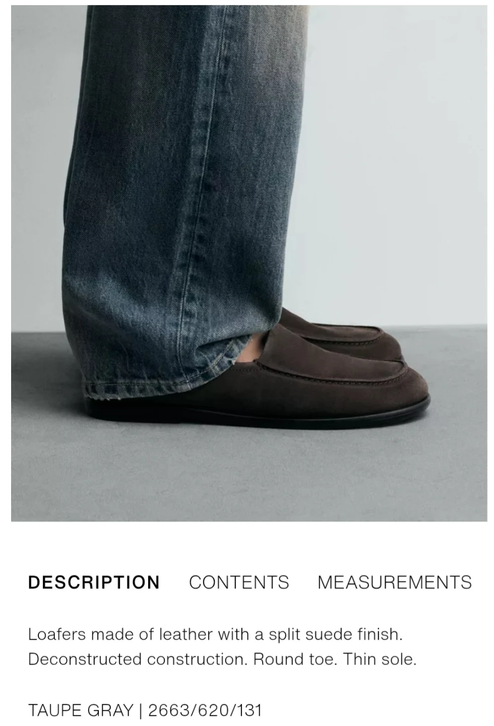 Loafers made of leather with a split suede finish. Deconstructed construction and round toe. Thin sole.