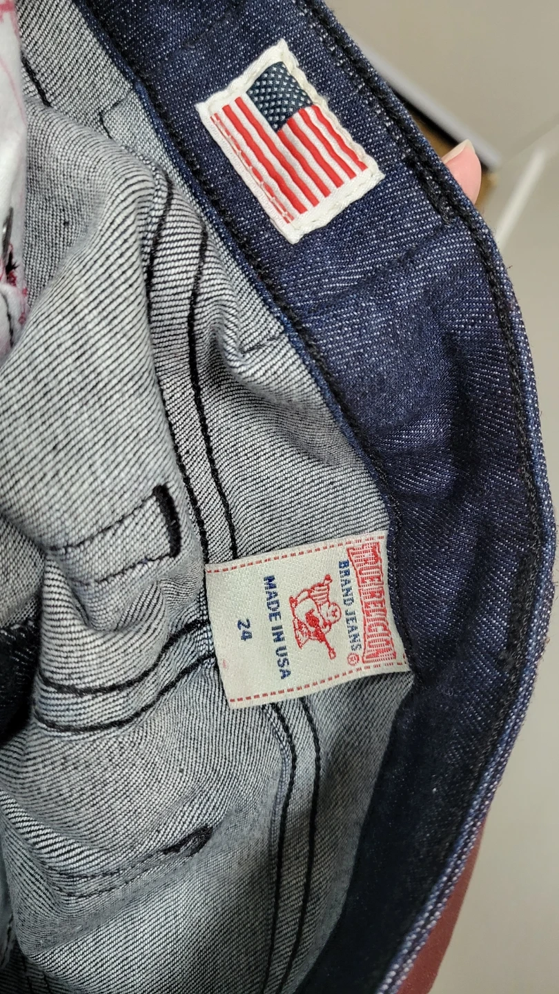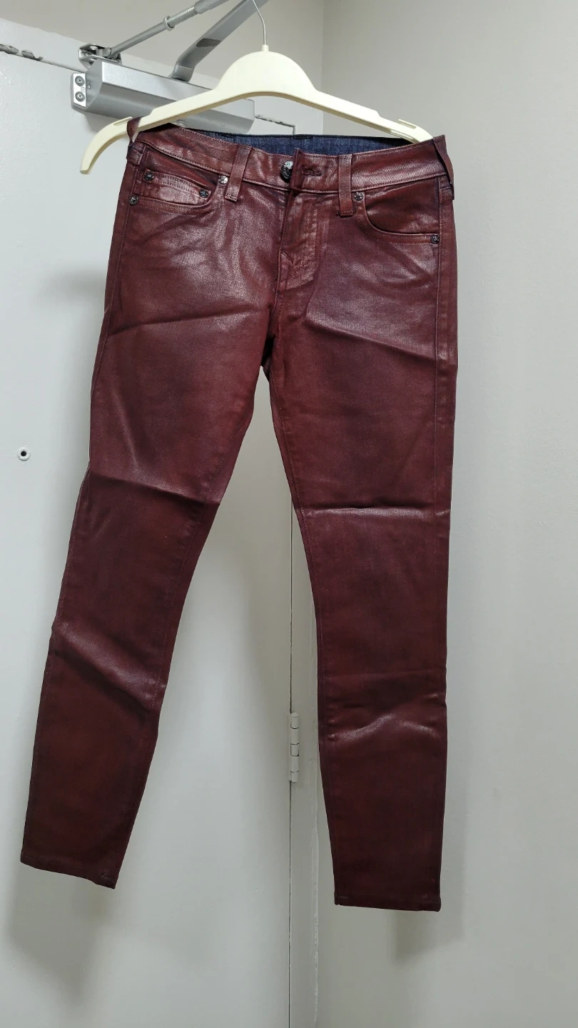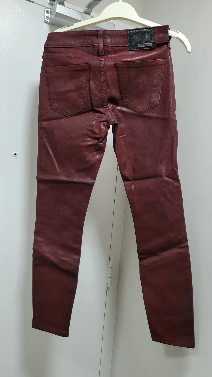 These are True Religion Brand Jeans in a burgundy colour. They're a skinny fit with a coated finish. Made in the USA. Cash only. Pick up only. Get it before it's donated. Final sale.