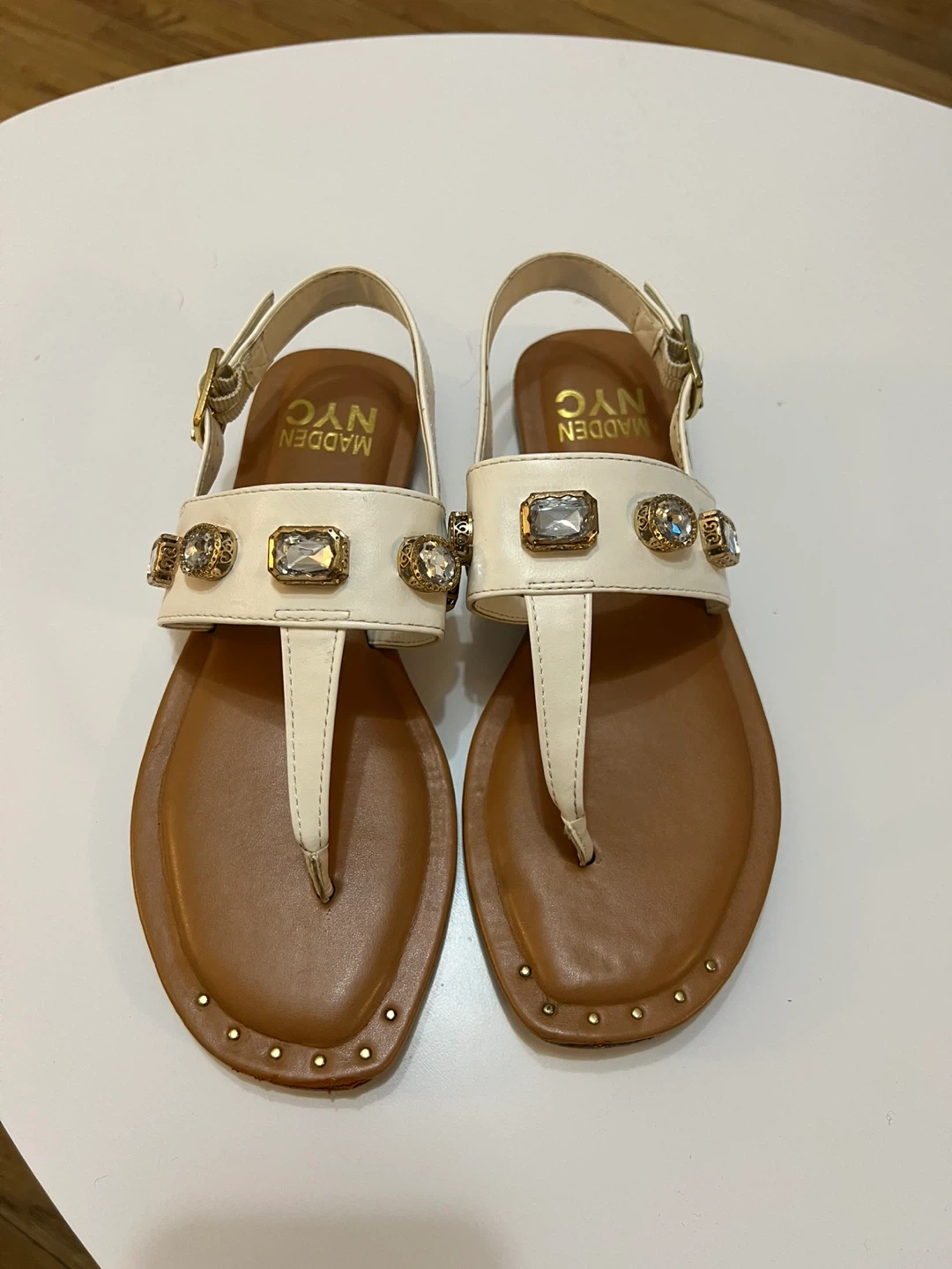 Madden NYC flat sandals in white with a T-strap design. Features decorative rhinestones and gold-tone studs along the straps. Adjustable ankle strap for a secure fit. Size 7.
