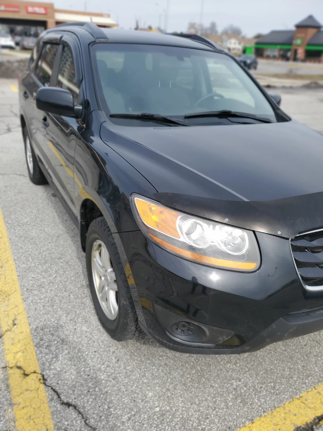 This is a black Hyundai Santa Fe. It's a four-door SUV with tinted windows and alloy wheels. It's equipped with a bug deflector on the hood. Have 140 km. AC WORKING GREAT. GOOD ALMOS NEW TIRES. BRAKES , PERFEC. AS IS 2 4. V4. NO ACCIDENTS NO LEAKS 2010. Hunday Santa fe.