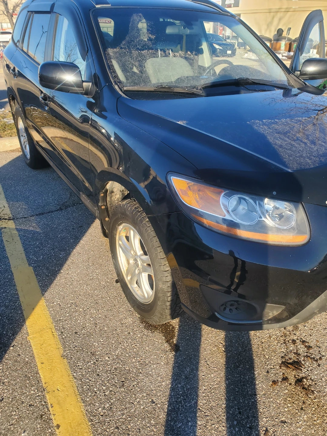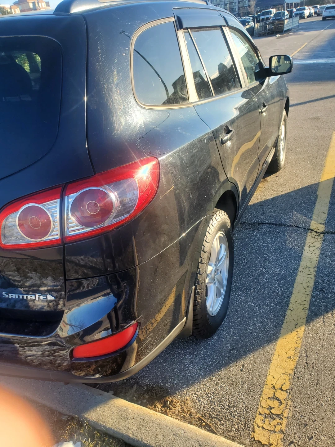 This is a black Hyundai Santa Fe. It's a four-door SUV with tinted windows and alloy wheels. It's equipped with a bug deflector on the hood. Have 140 km. AC WORKING GREAT. GOOD ALMOS NEW TIRES. BRAKES , PERFEC. AS IS 2 4. V4. NO ACCIDENTS NO LEAKS 2010. Hunday Santa fe.
