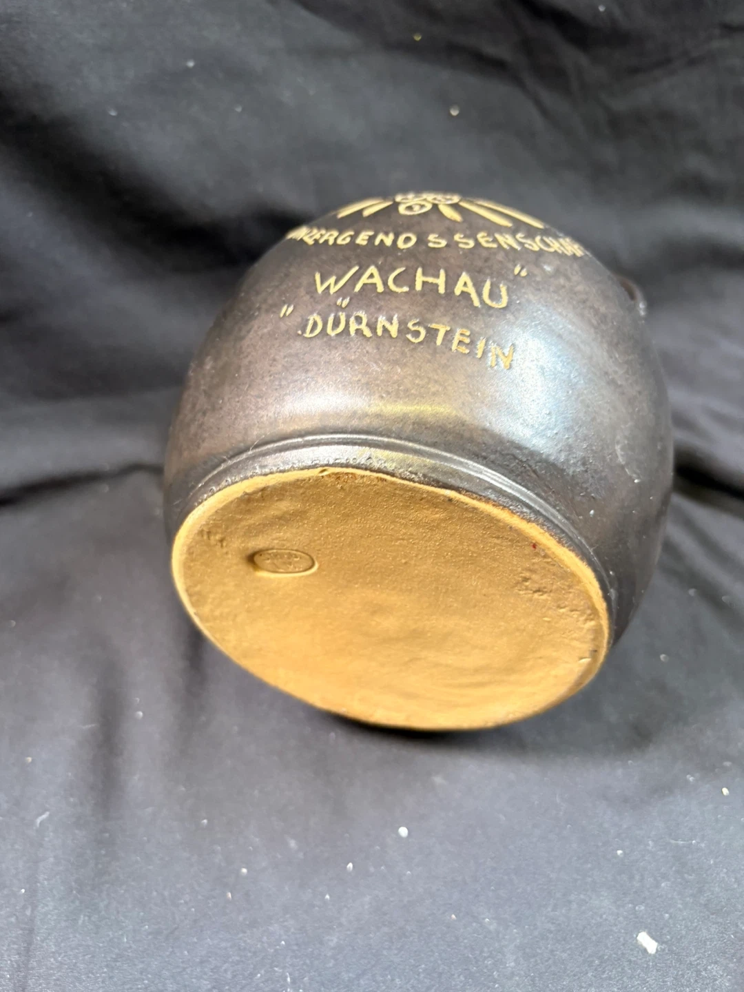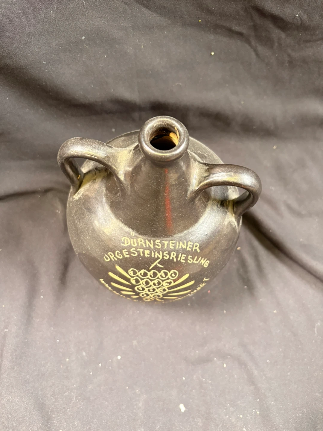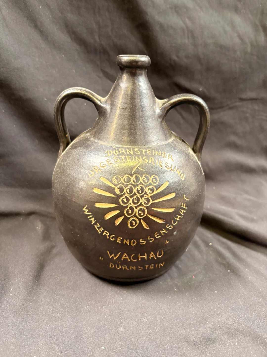 This is a Durnsteiner Urgesteinsriesling jug from Wachau. It's a dark brown ceramic jug with two handles and a narrow neck. The jug has gold lettering and a design of grapes.