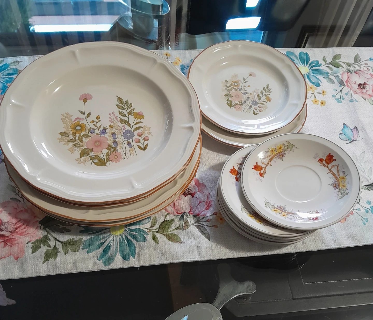 A set of 4 Chinese stoneware cream-coloured dinner plates (10.5 in diameter) and 2 small plates with the same print and 6 saucers with a delicate floral pattern. No chips on the plates.