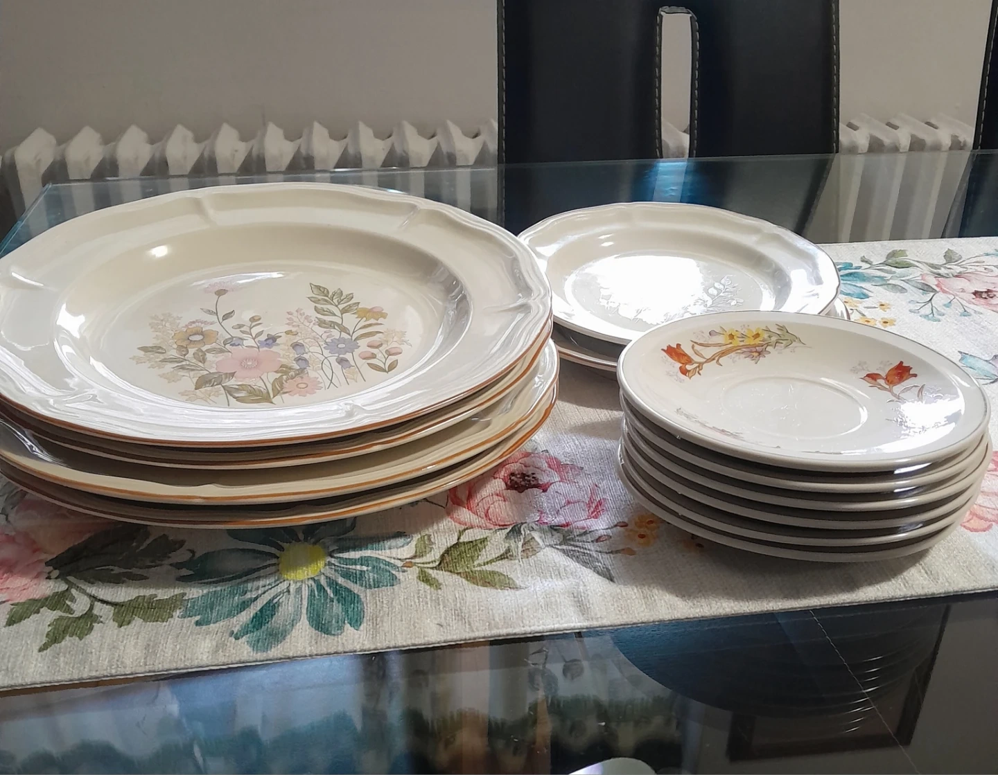A set of 4 Chinese stoneware cream-coloured dinner plates (10.5 in diameter) and 2 small plates with the same print and 6 saucers with a delicate floral pattern. No chips on the plates.