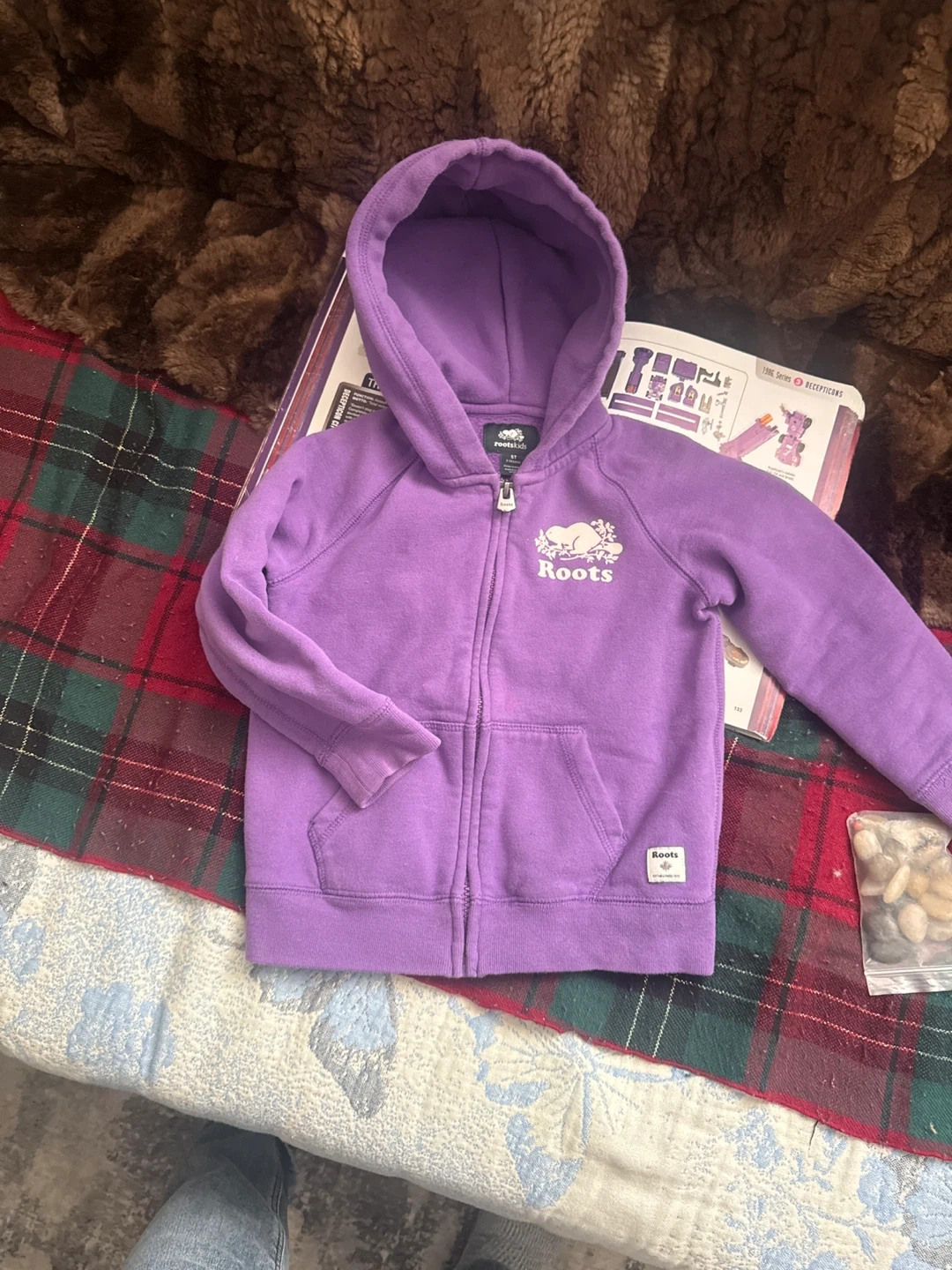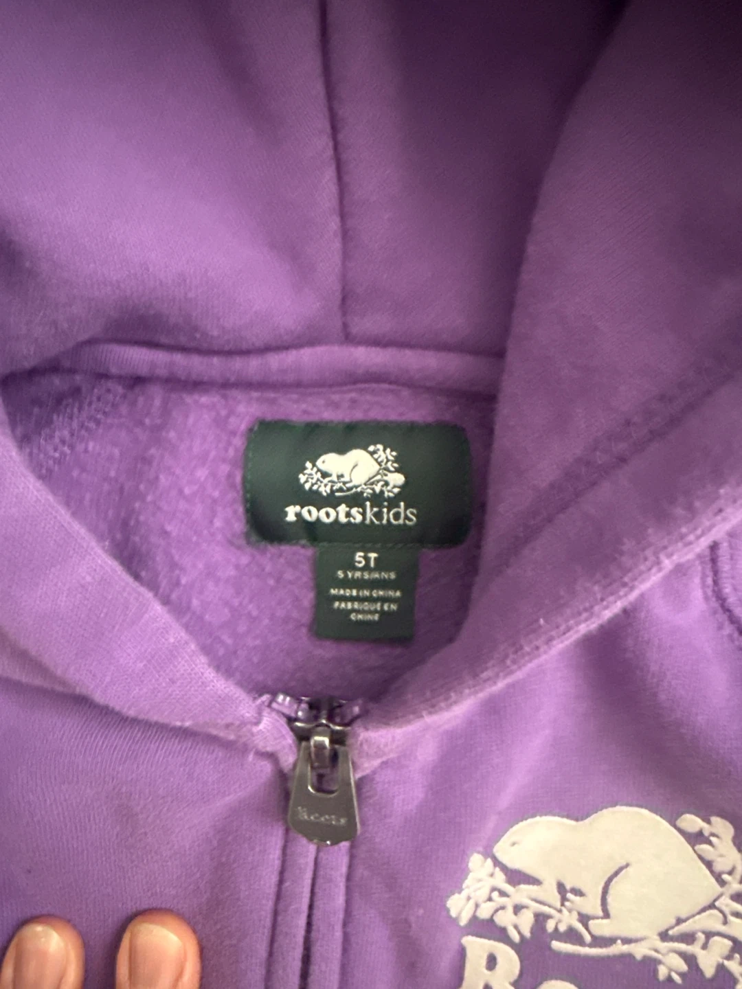 This is a Roots kids purple full zip hoodie. It's a size 5T. Made of soft cotton blend material.