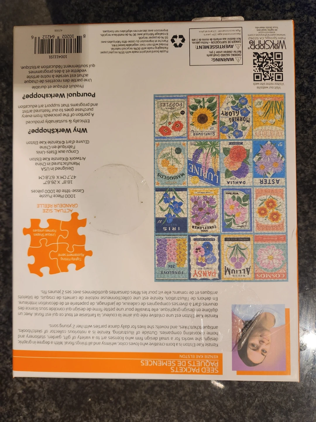 This 1000 piece jigsaw puzzle features vintage seed packet designs by artist Kerzie Kae Elston. Put together only one time. Brand new before that.