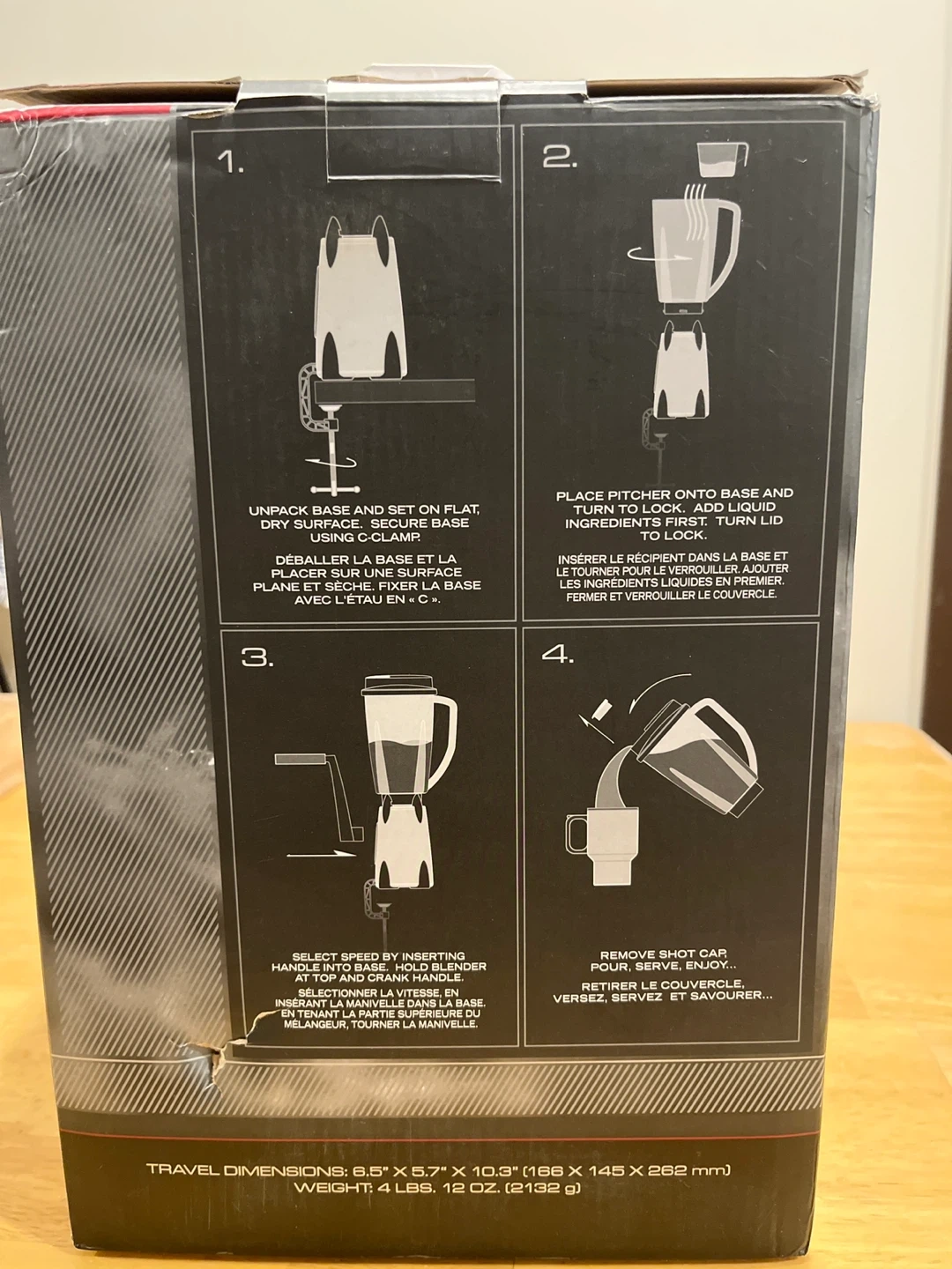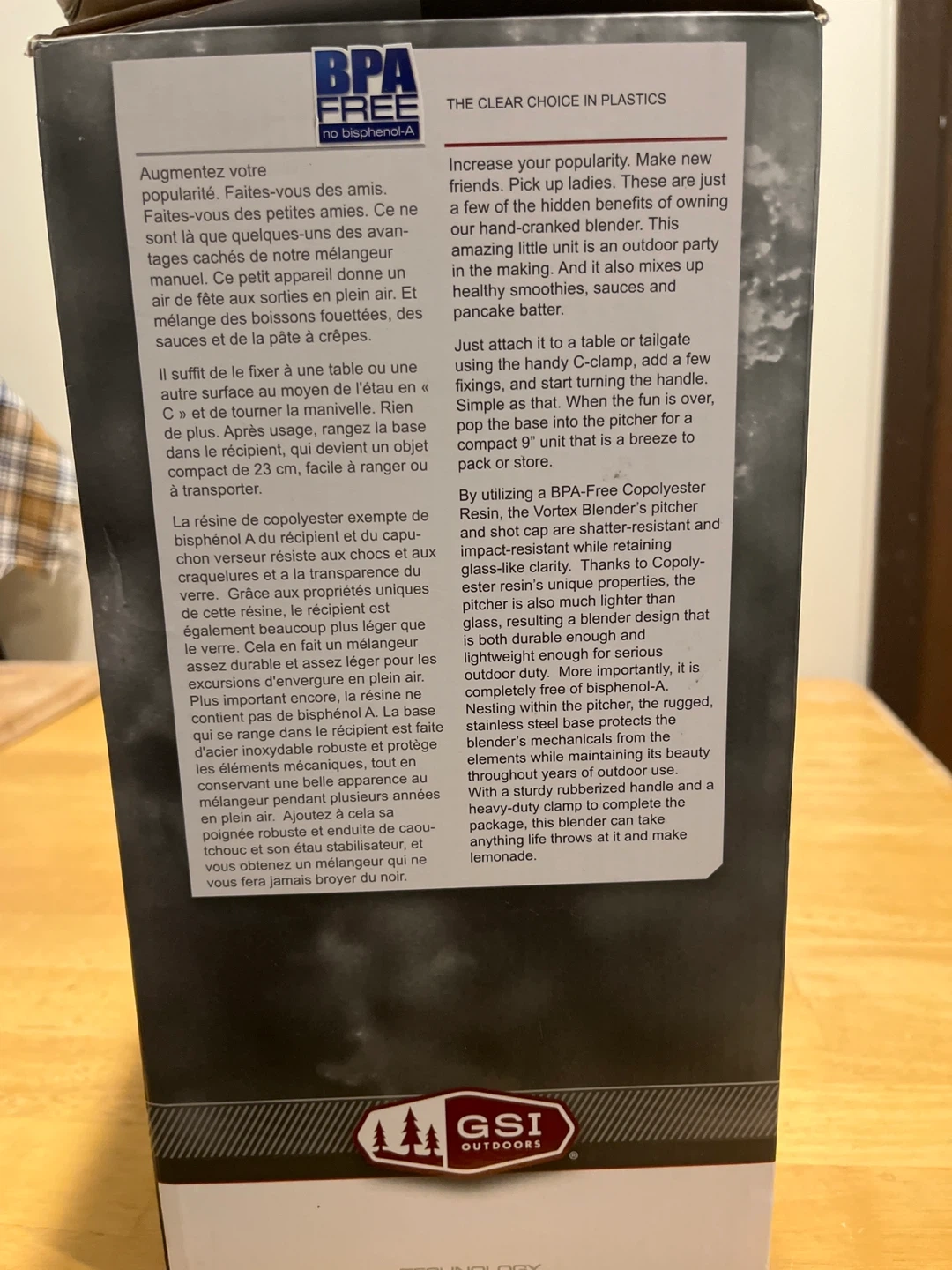 Nesting, two-speed, hand-cranked blender with a 1.5 L graduated pitcher. It's made with BPA-free copolyester resin and has a durable stainless steel base. Just attach it to a table or tailgate using the handy C-clamp.