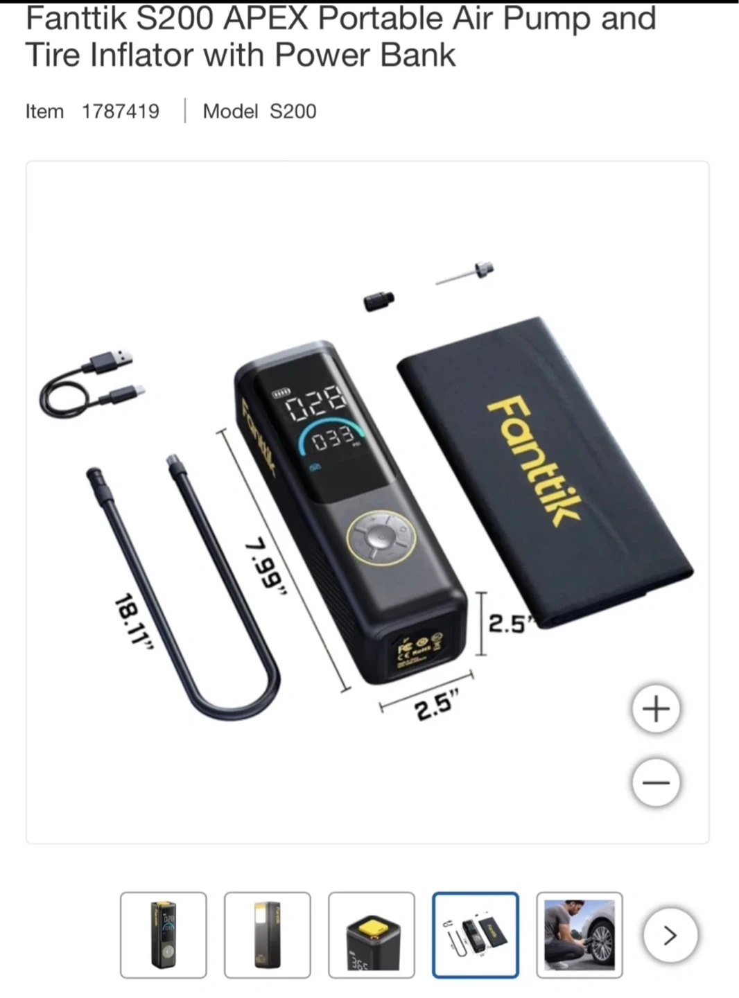 This is the Fanttik S200 APEX portable air pump and tire inflator with power bank. It's compact and includes a USB cable and hose. It's great for quick tire pressure checks and inflation on the go!