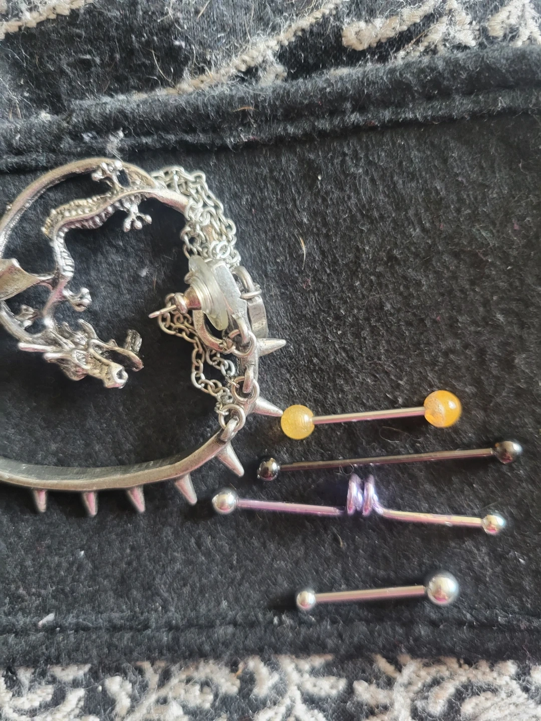 Dragon ear cuff with chain detail and four assorted barbell piercings. Includes one with yellow stones, one dark, and two silver barbells. Add some edgy flair!