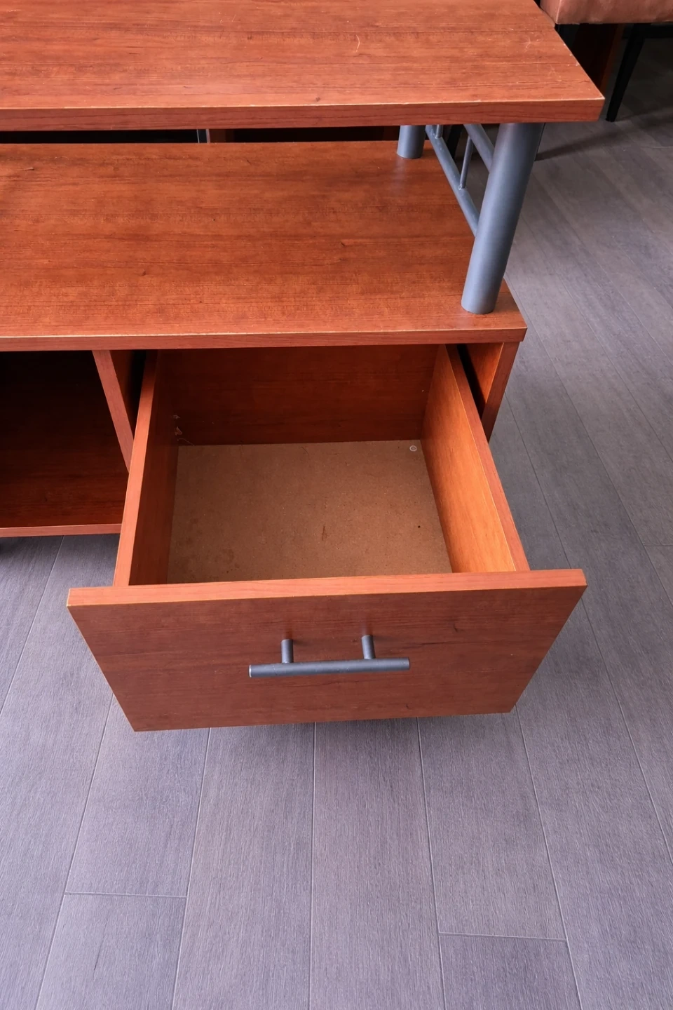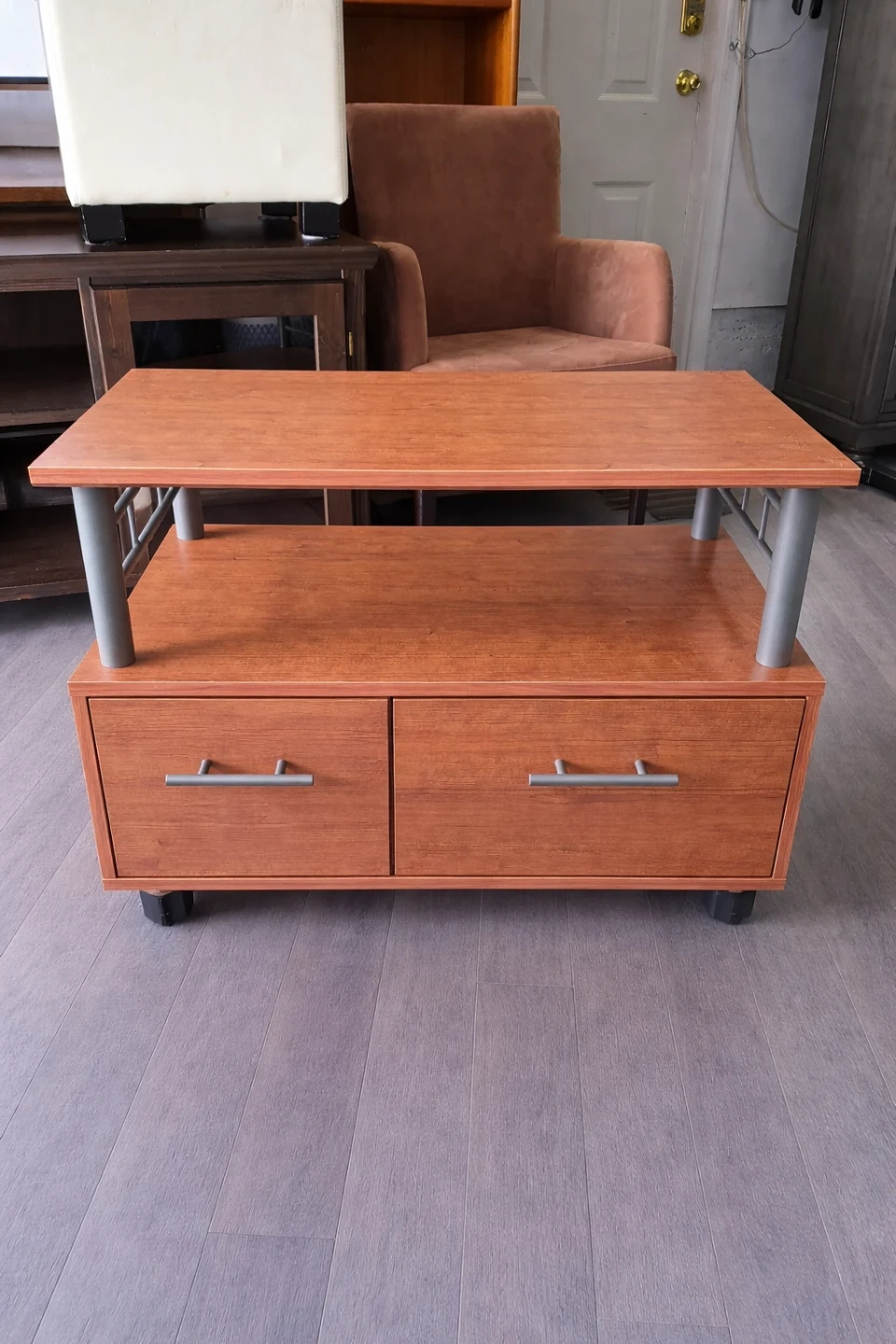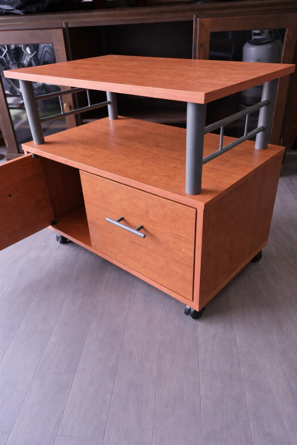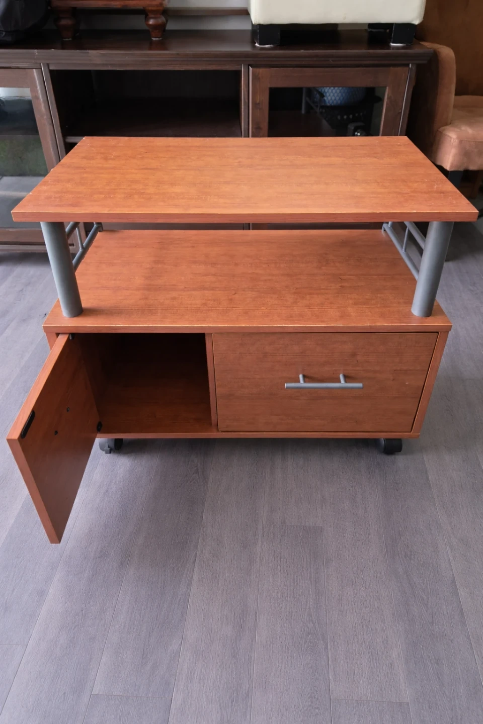 This wooden TV stand has a drawer and a cabinet space for storage. It's a handy piece for keeping media consoles organized. Comes with wheels for easy moving.