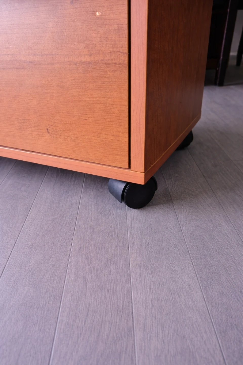 This wooden TV stand has a drawer and a cabinet space for storage. It's a handy piece for keeping media consoles organized. Comes with wheels for easy moving.