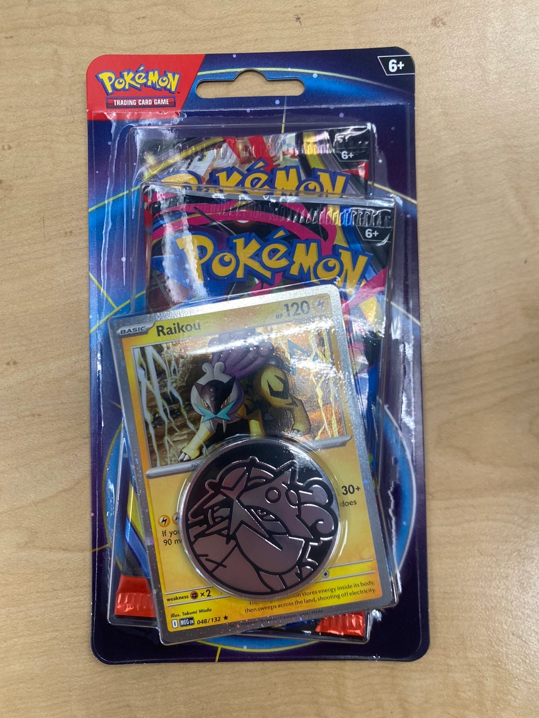 Pokemon Trading Card Game pack featuring Raikou card and metal coin. Includes 1 Phantasmal Flames booster pack and 1 Mega Evolutions booster pack.