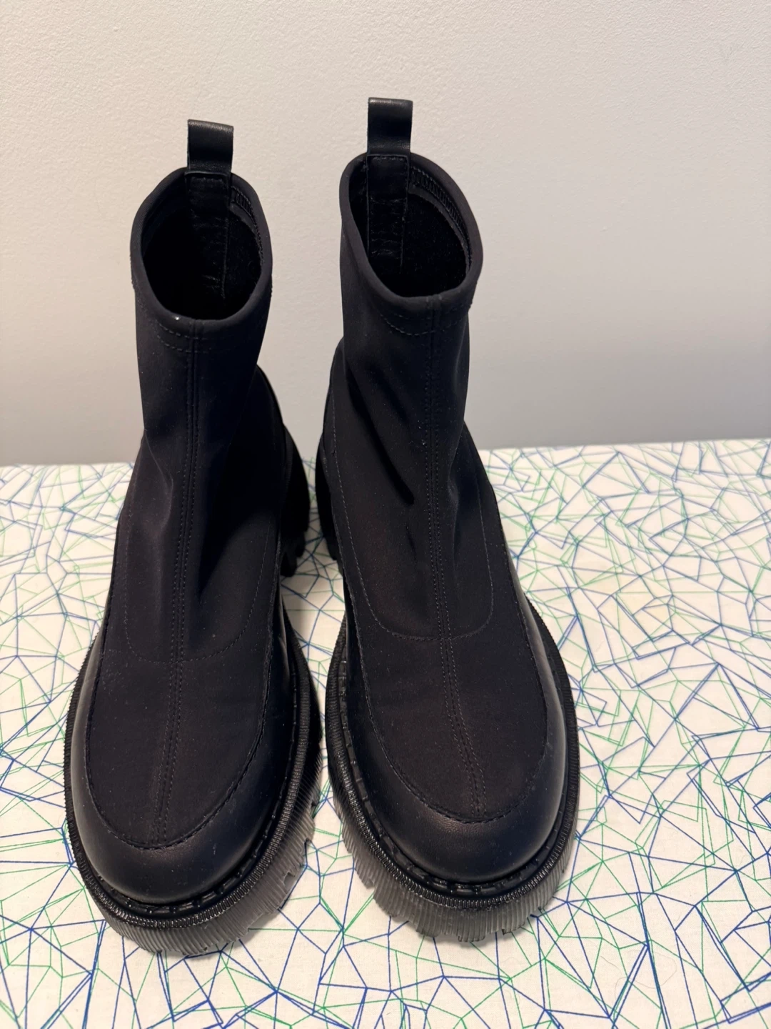 Comfortable black sock boots with a modern chunky sole. These boots feature a sleek fabric upper and a durable sole. They're easy to slip on and off.