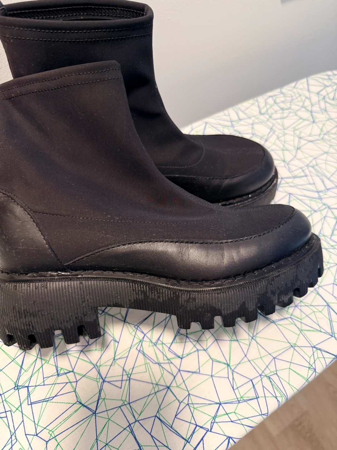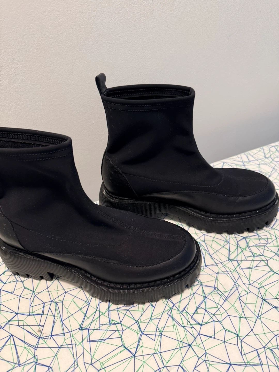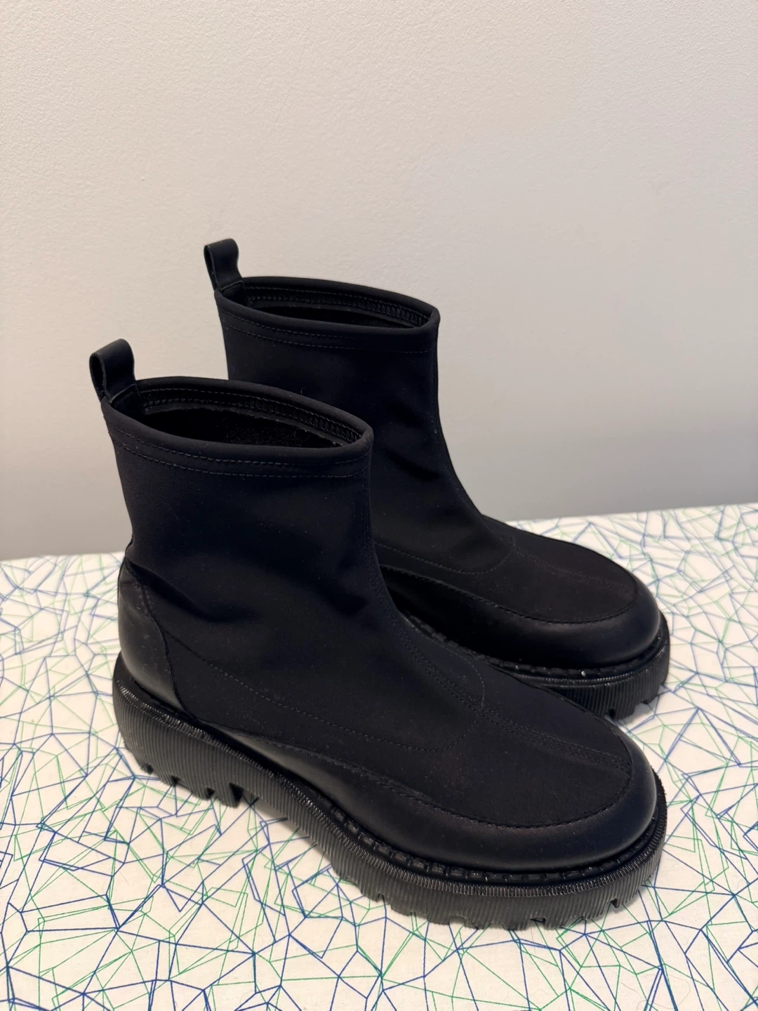 Comfortable black sock boots with a modern chunky sole. These boots feature a sleek fabric upper and a durable sole. They're easy to slip on and off.