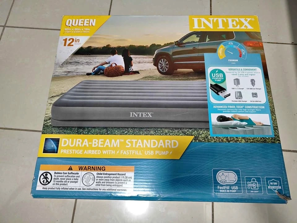 Intex queen-size air mattress with built-in electric pump. Used for a couple of months, in good condition. Inflates and deflates easily, holds air well for a day, and is comfortable. Perfect for guests or temporary use.