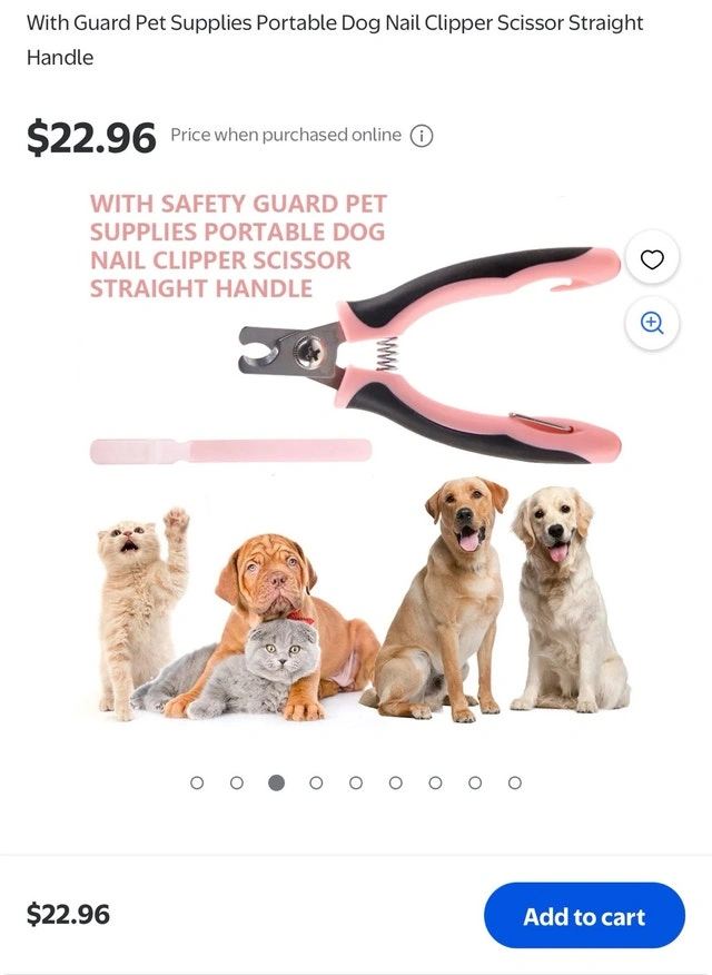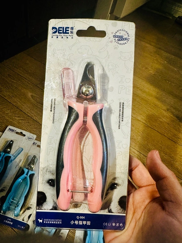 Selling pet nail clippers with a safety guard and straight handle, suitable for dogs, cats, and other small animals. Originally $22.96, selling for $8 each or 2 for $10. Available in blue (5 in stock) and pink (1 left). Pickup is in the McKernan area. Cash only.