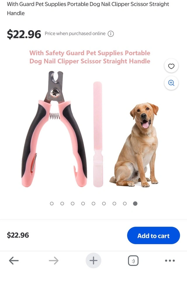 Selling pet nail clippers with a safety guard and straight handle, suitable for dogs, cats, and other small animals. Originally $22.96, selling for $8 each or 2 for $10. Available in blue (5 in stock) and pink (1 left). Pickup is in the McKernan area. Cash only.