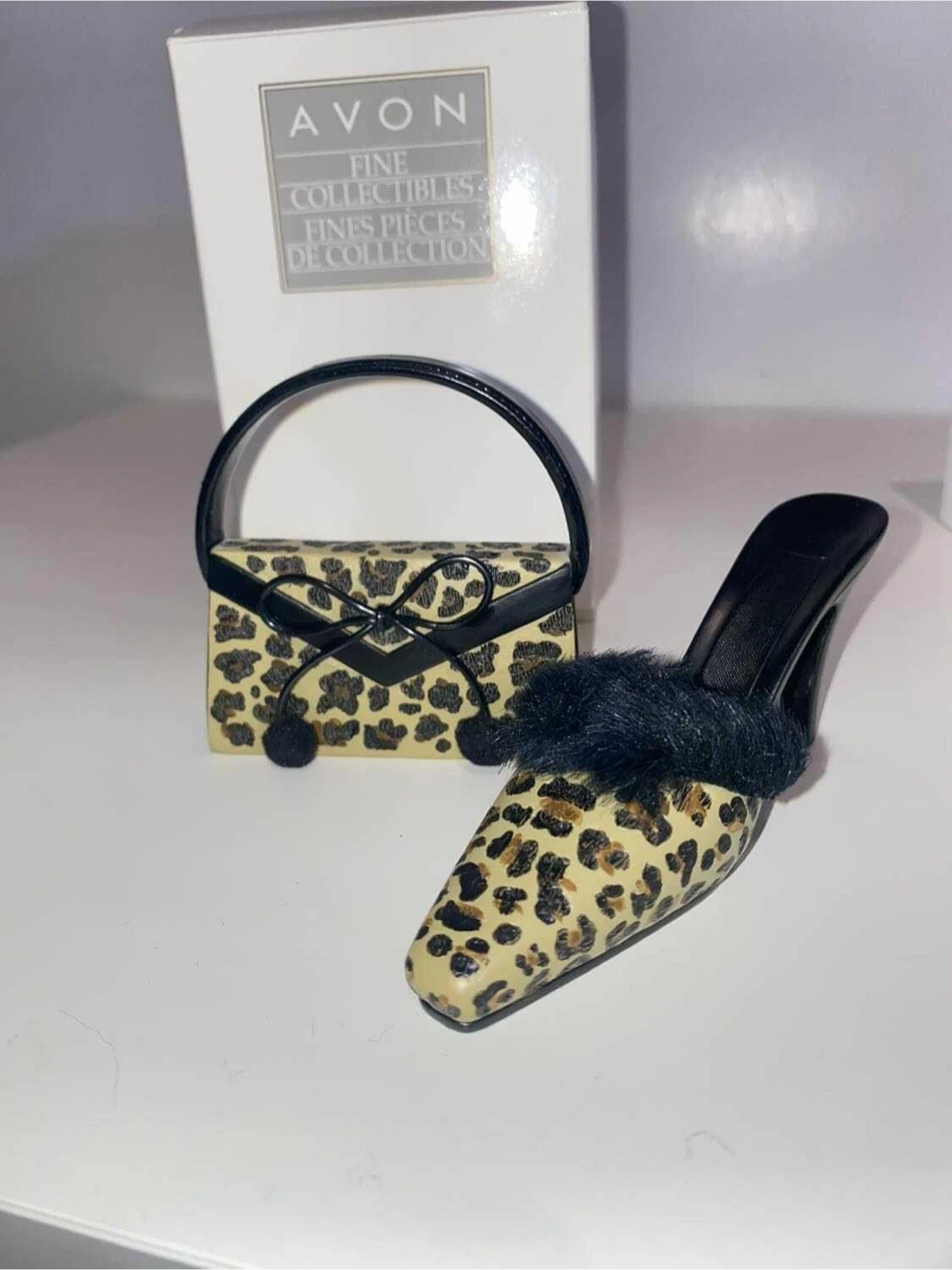This is an Avon collectible set featuring a miniature high heel shoe and a matching handbag. Both pieces are adorned with a leopard print design and a black bow accent. The shoe also has a fluffy black trim.