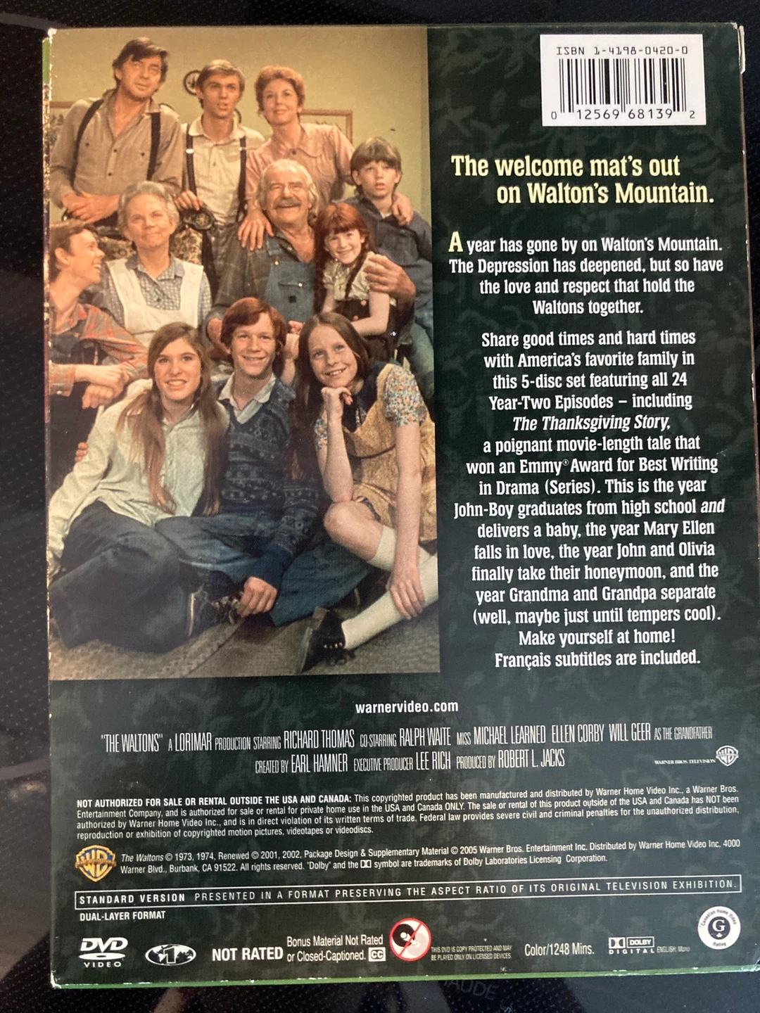 This DVD set includes all 5 discs for The Complete Second Season of The Waltons. It features the Thanksgiving Story episode, a nominee for an Emmy Award for Best Writing. The season follows John-Boy's experiences in high school and the arrival of a baby. It also covers Mary Ellen and John's love story and the family's joy with Grandma and Grandpa's return. Subtitles in French are included.