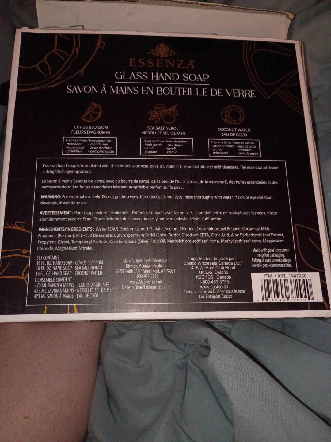 This Essenza glass hand soap set includes three 16 oz bottles. Scents are Citrus Blossom, Sea Salt Neroli, and Coconut Water. It's formulated with shea butter, aloe, olive oil, vitamin E, and essential oils.