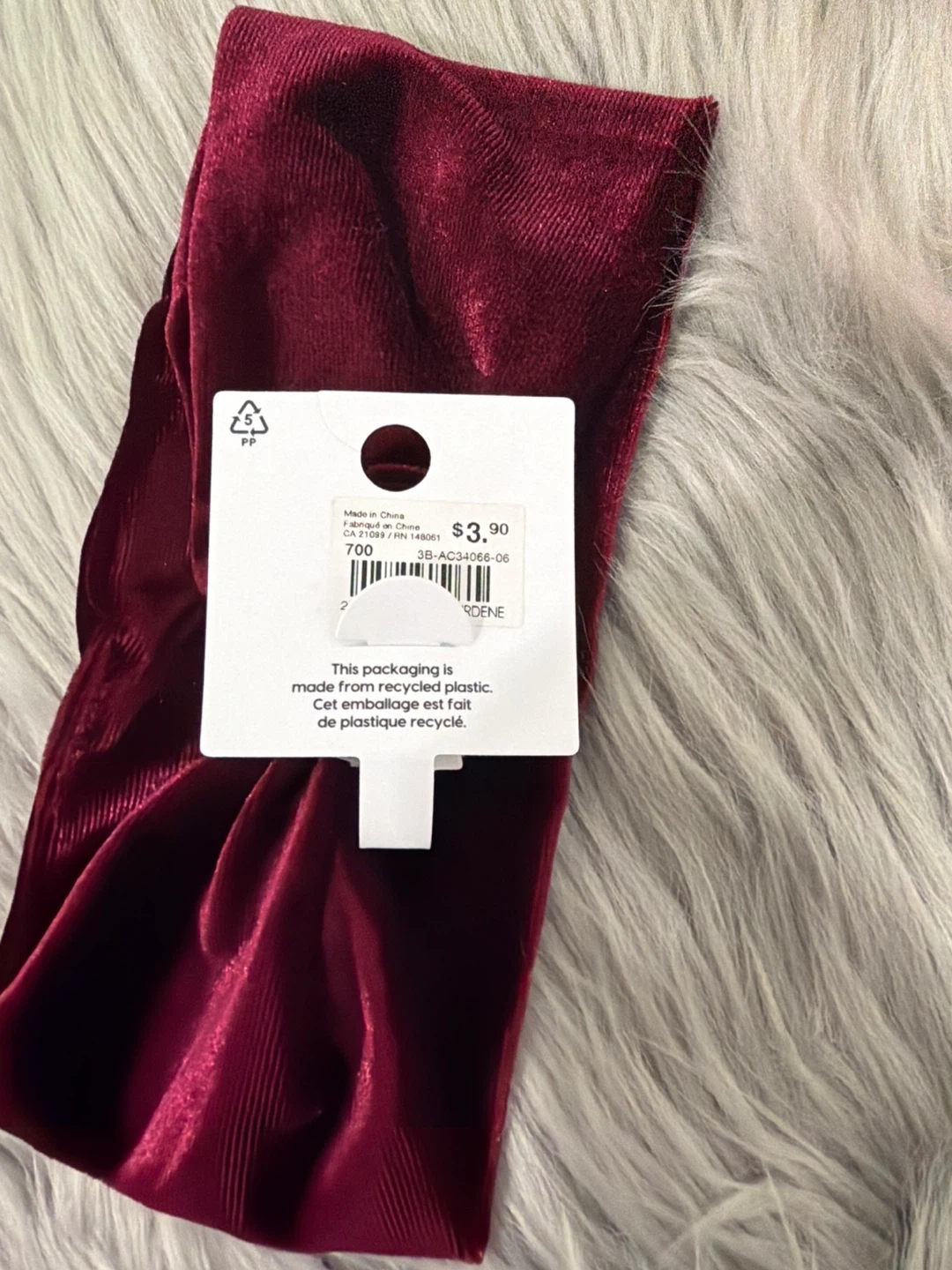 This is a burgundy velvet headband. It's made with a soft velvet material. This headband is suitable for accessorizing outfits.