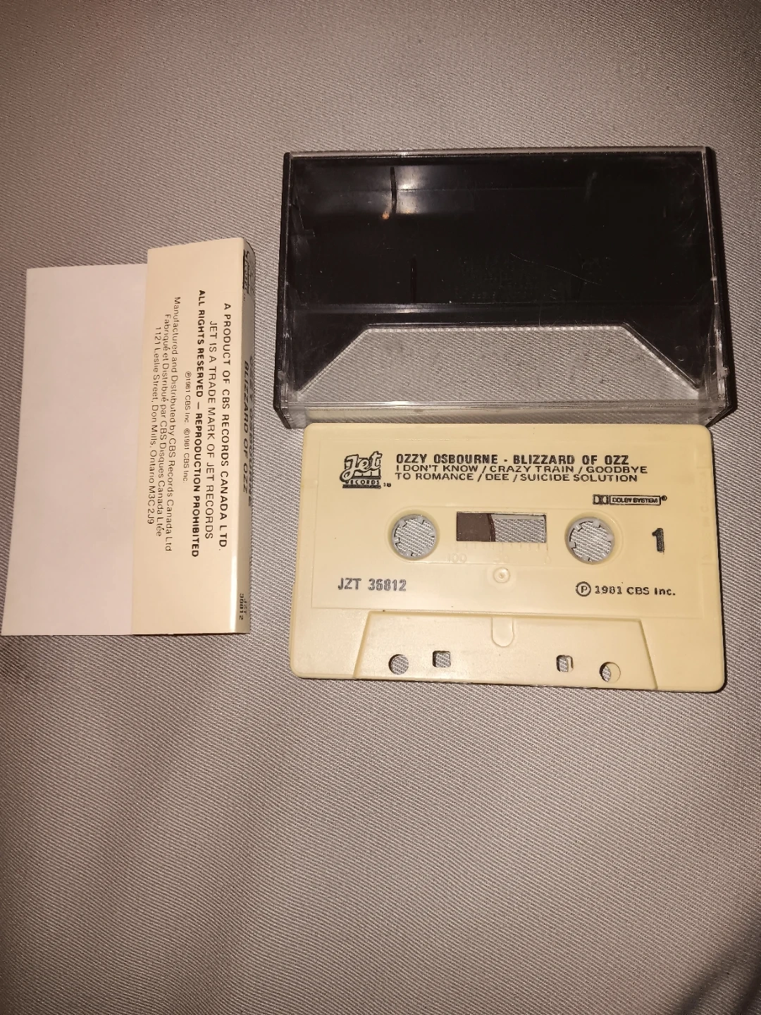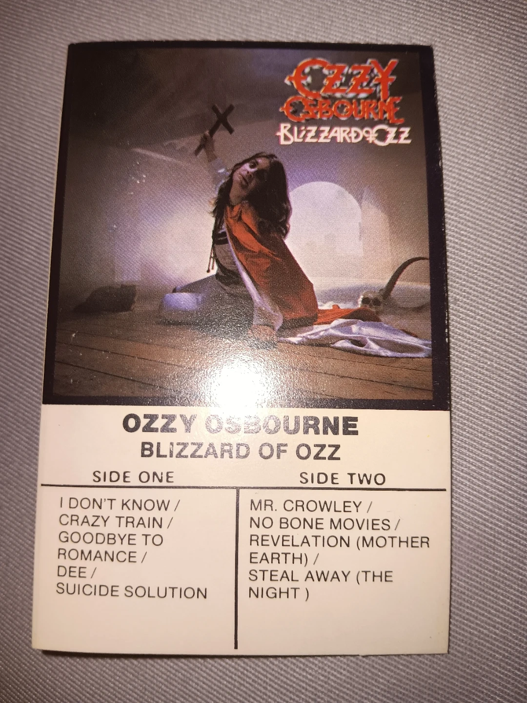 Ozzy Osbourne's Blizzard of Ozz cassette tape. Features tracks like 'I Don't Know' and 'Suicide Solution'. Manufactured by Jet Records in 1981. This is a classic heavy metal album.