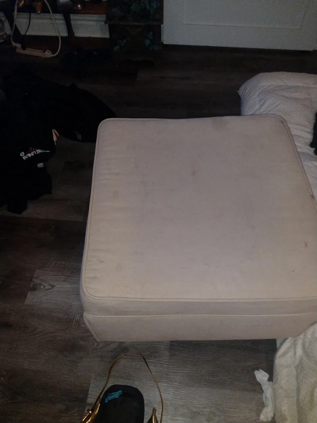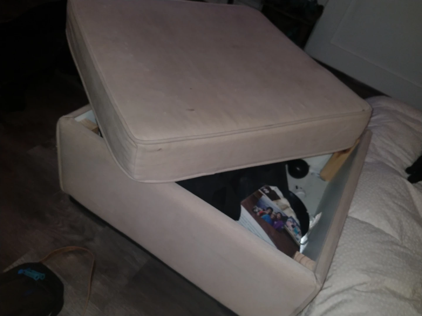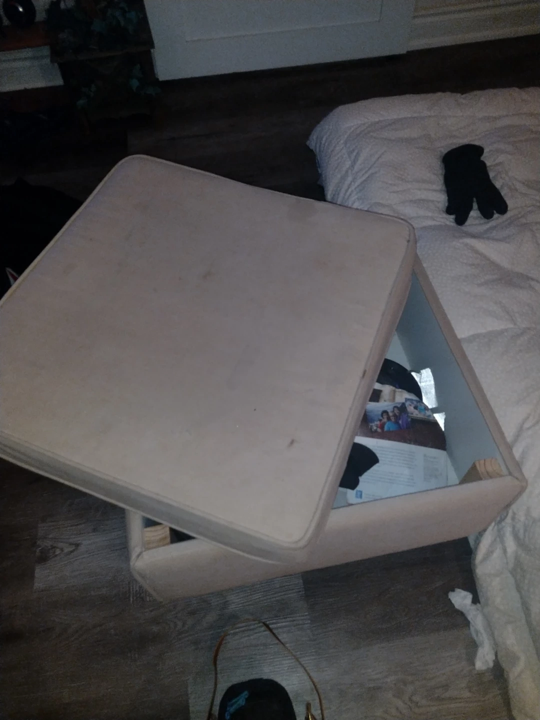 This beige storage ottoman offers hidden space for your belongings. Its lift-top design makes accessing contents easy. It's a practical addition for any room needing extra storage!