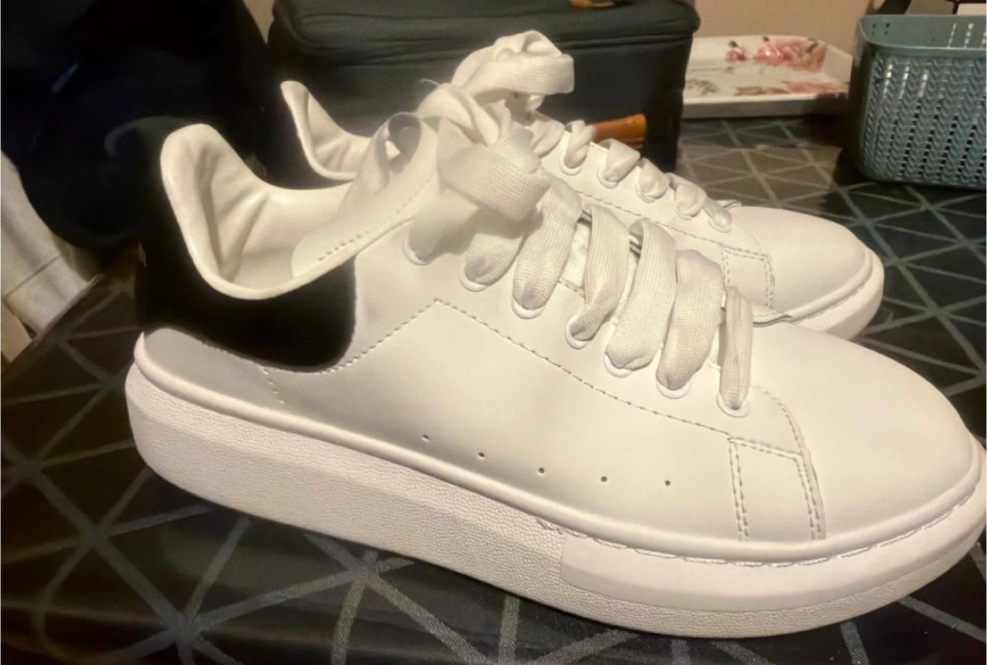 Alexander McQueen white leather sneakers with a black heel accent. These are a size 43. Platform sole design.