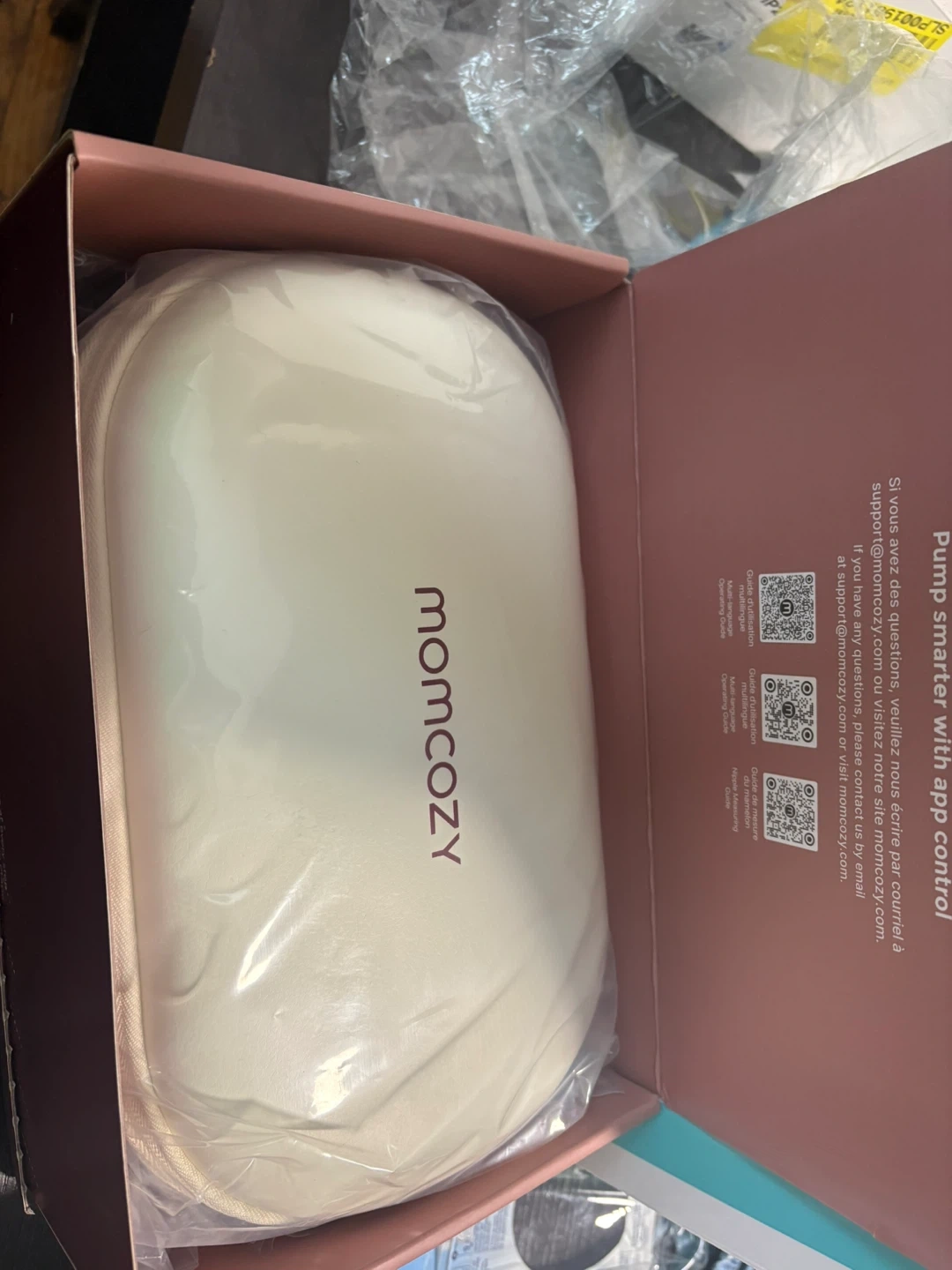 Momcozy M5 Smart Wearable Breast Pumps with app control. It's a set of two portable breast pumps. The pumps come in a carrying case.