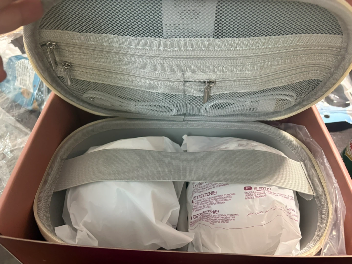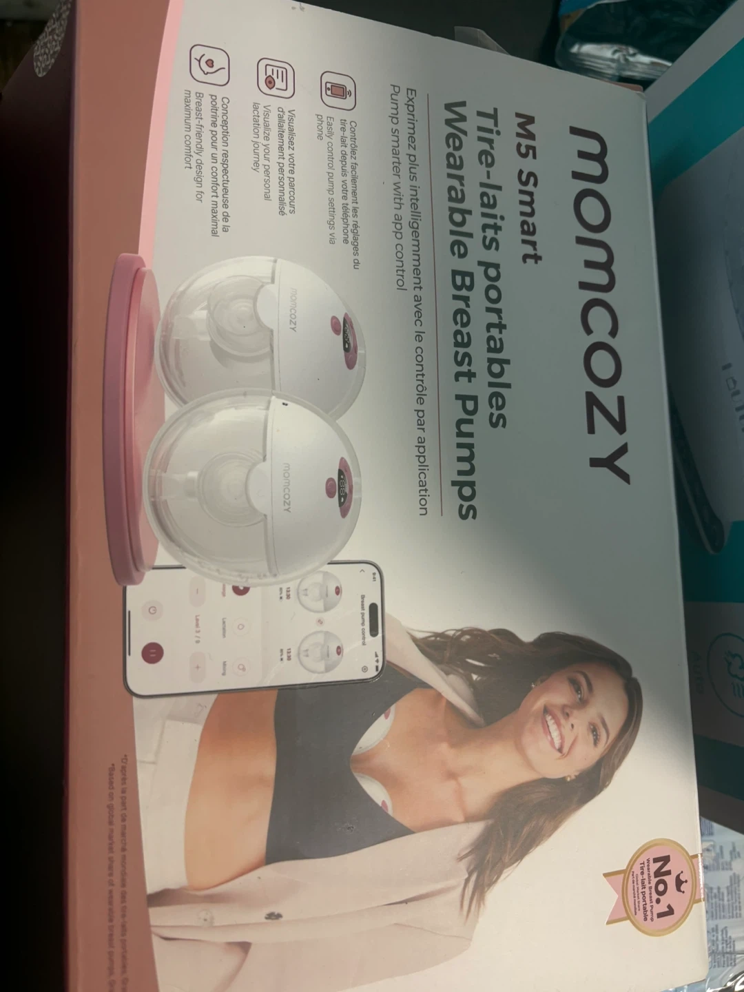 Momcozy M5 Smart Wearable Breast Pumps with app control. It's a set of two portable breast pumps. The pumps come in a carrying case.