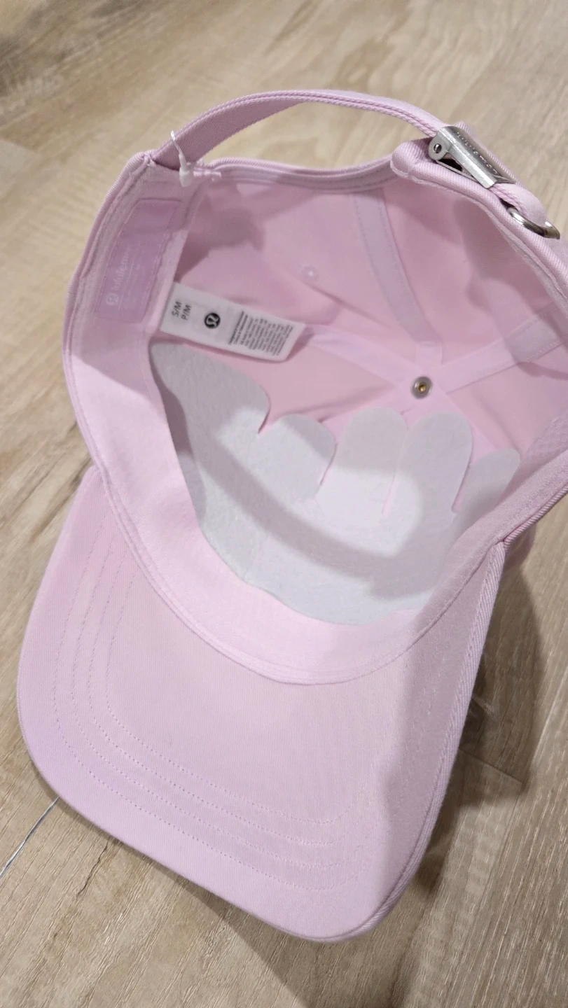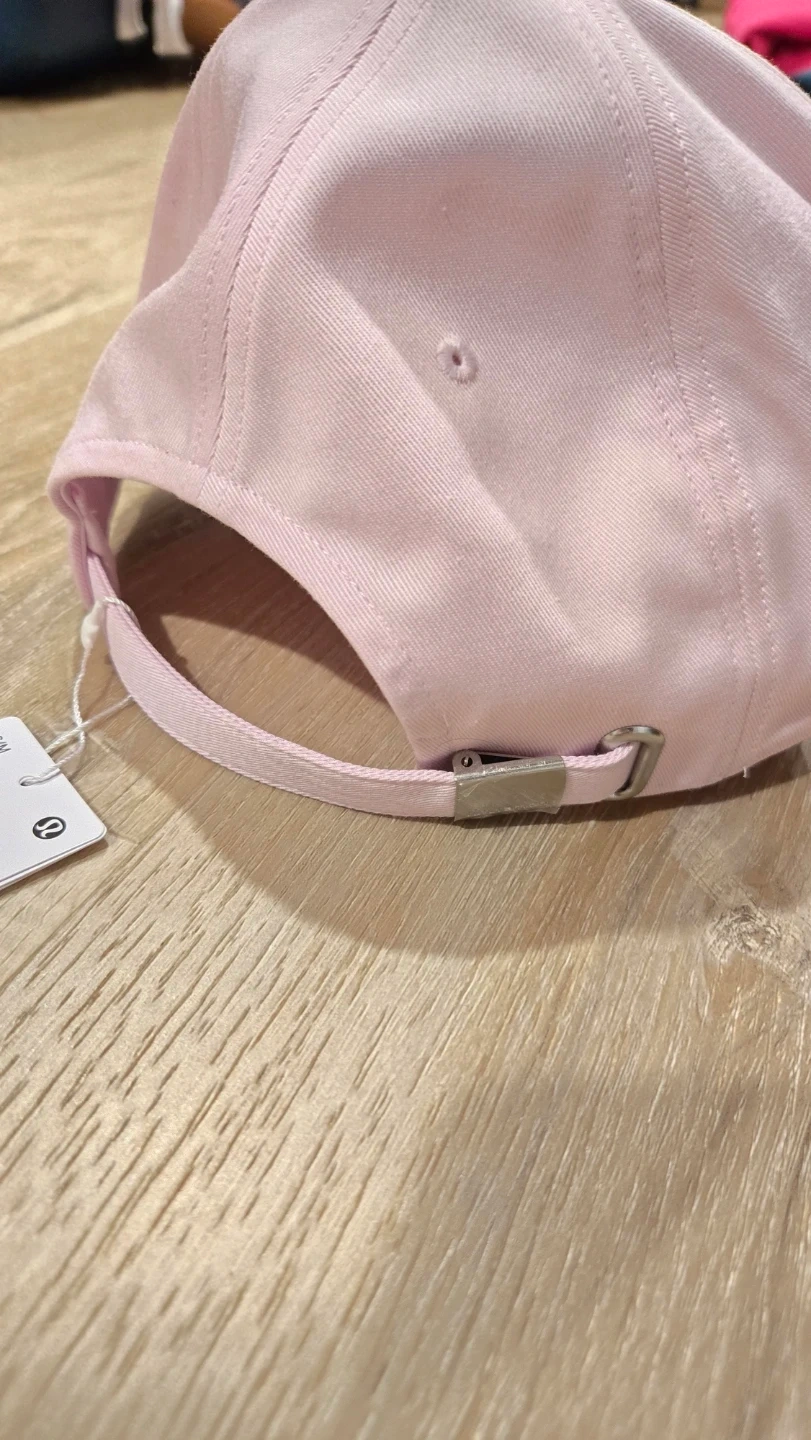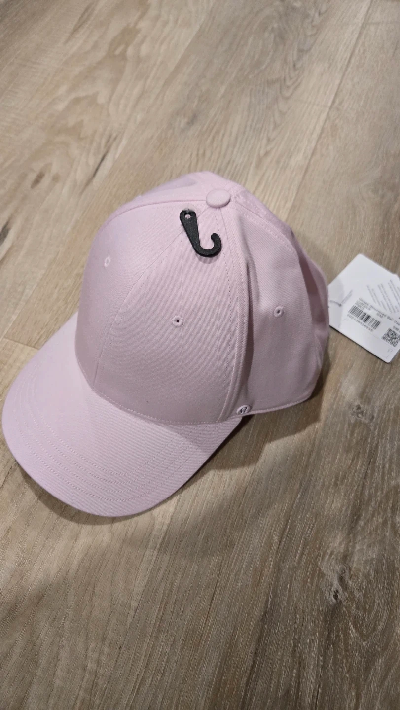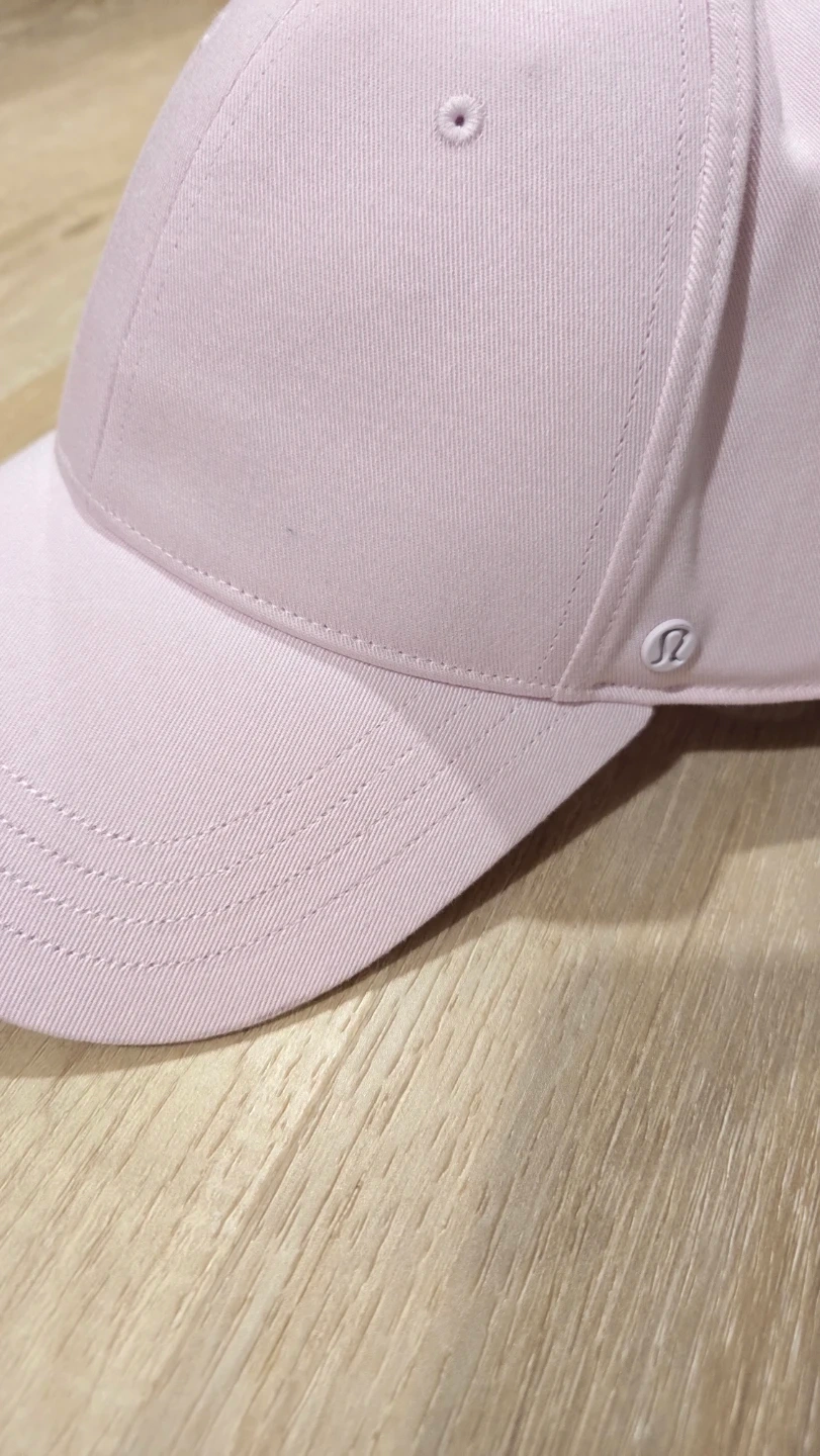 This is a Lululemon baseball cap in a light pink colour. It has an adjustable strap closure. The material is soft and comfortable.