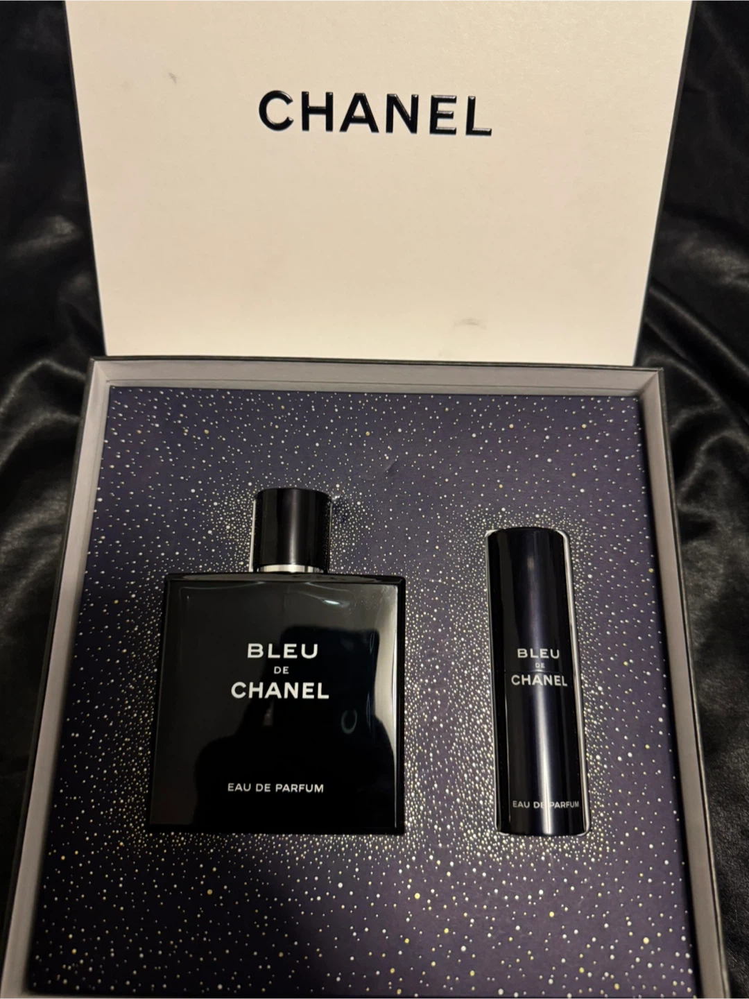 This is a gift set featuring Chanel Bleu de Chanel Eau de Parfum. Male Fragrance. It includes the main fragrance bottle and a travel-sized spray. The set comes in its original Chanel packaging. Perfect for fragrance enthusiasts!