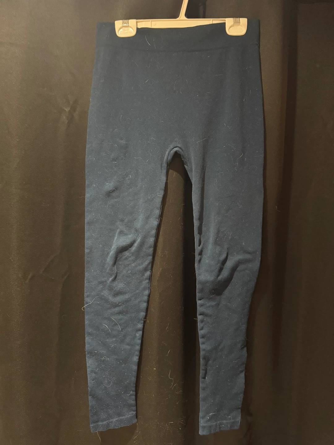 These are a pair of navy blue leggings. They're made from a soft, stretchy material. A comfy staple for your everyday wardrobe!