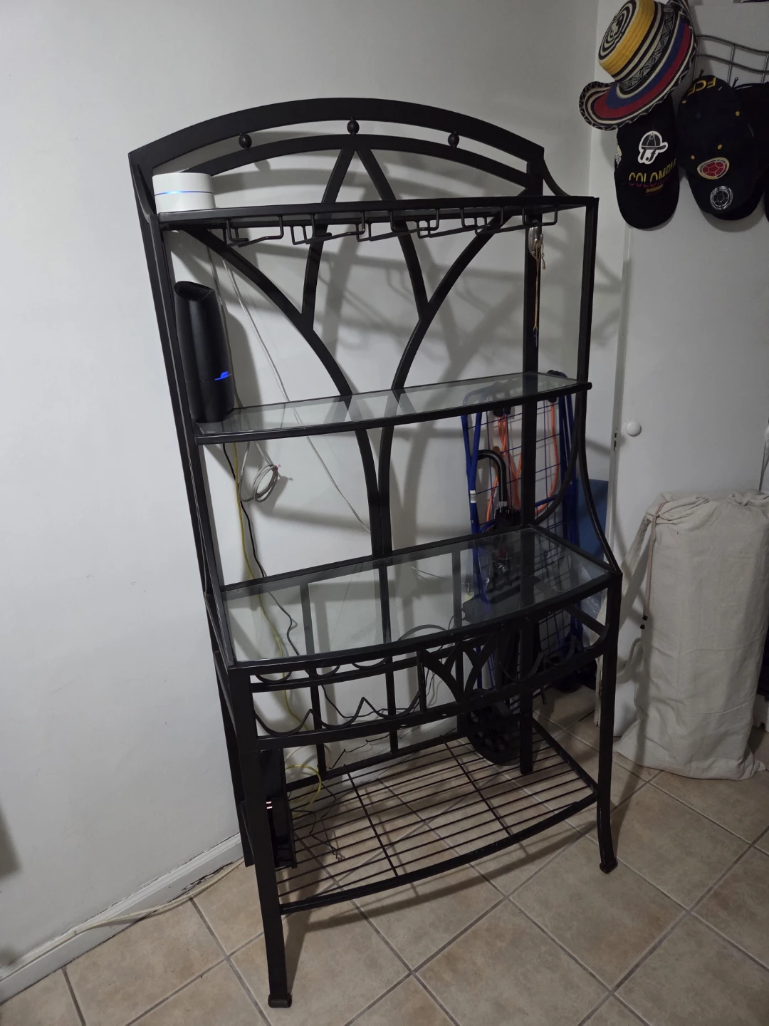 ✅ Strong steel frame✅ Glass shelves in great condition✅ Built-in wine glass holder✅ Modern and elegant design✅ Great for living rooms, dining areas, or apartments