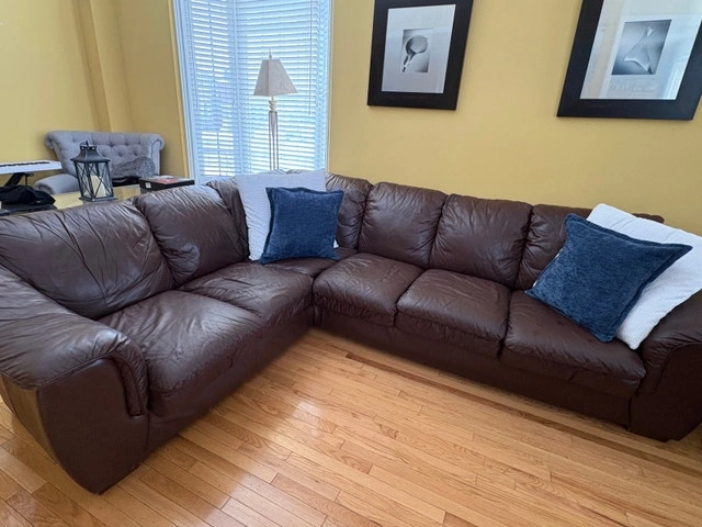 This is a used brown leather sectional sofa, perfect for a living room or entertainment area. The sectional is in good condition, with some signs of wear, as visible in the pictures, but is still comfortable. Pick up only.