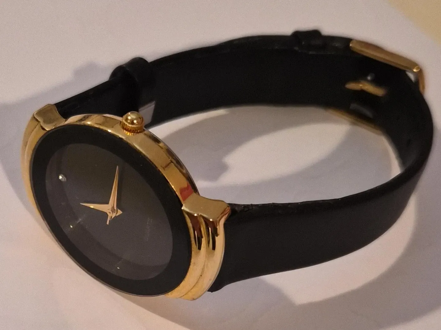 This is a gold-tone watch with a black band. It features a round black face and a quartz movement. The band appears to be leather.