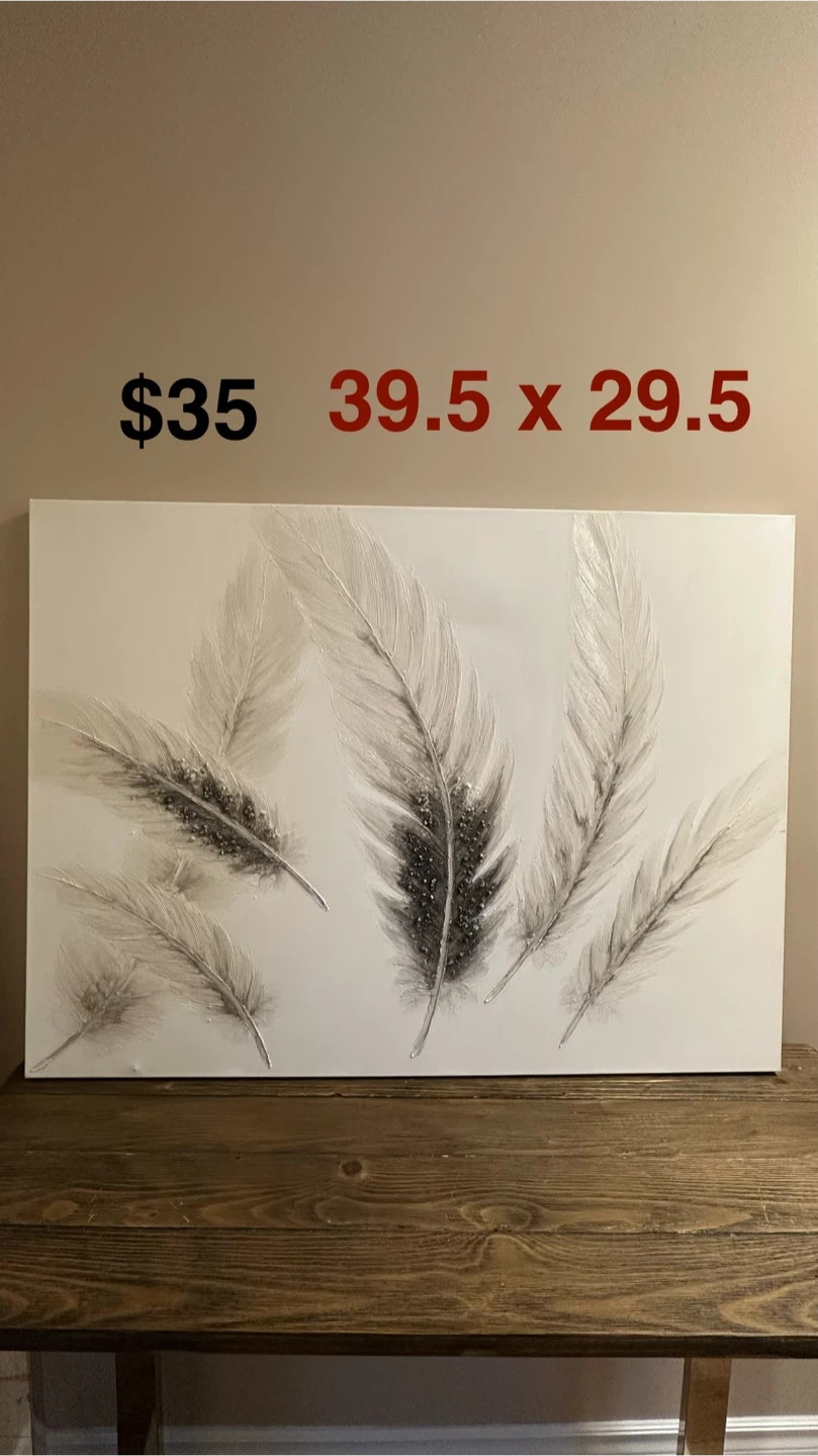 Large textured canvas art featuring five detailed feathers in black and white. It measures 39.5 inches by 29.5 inches. Adds a sophisticated touch to any room!
