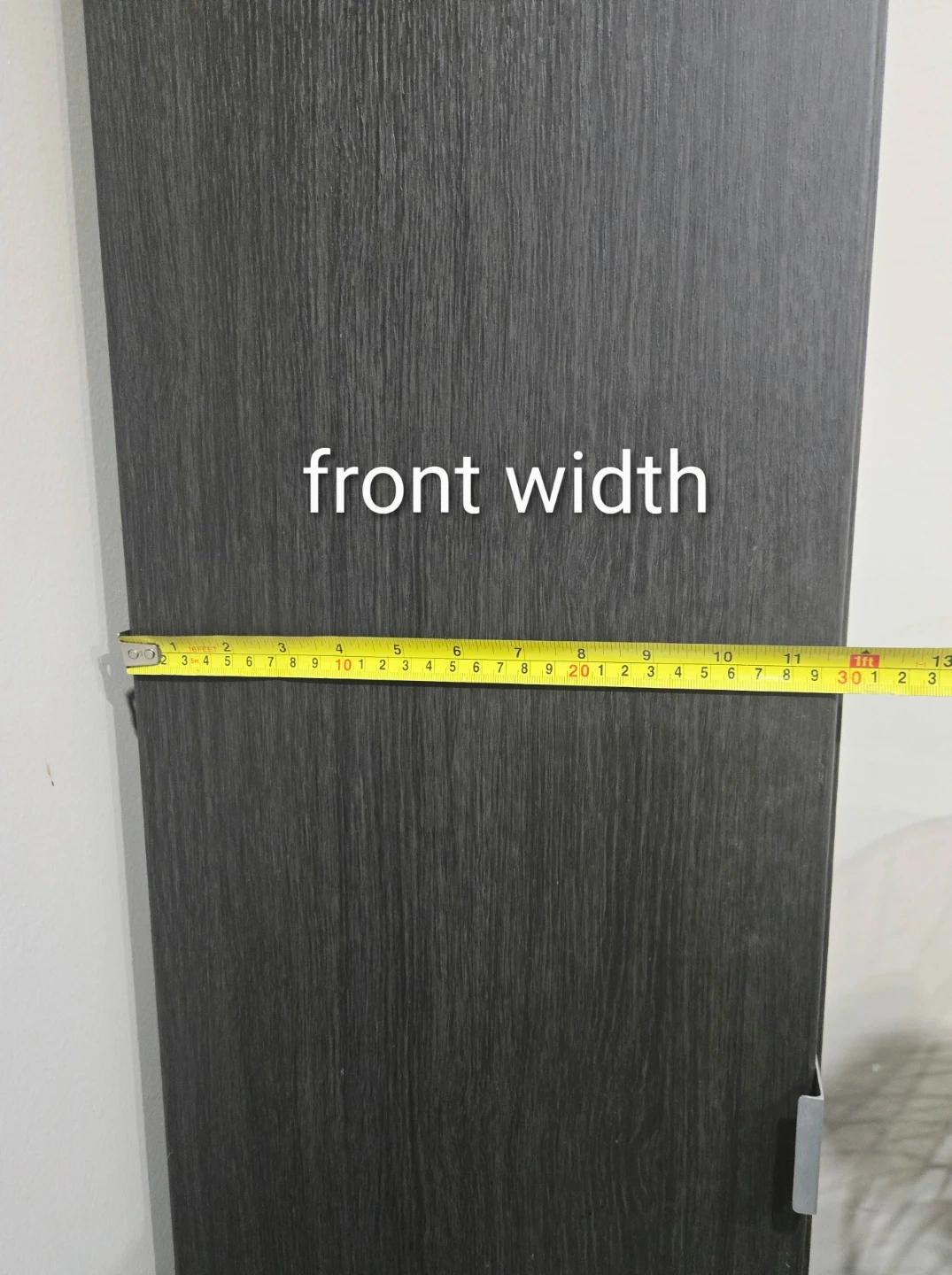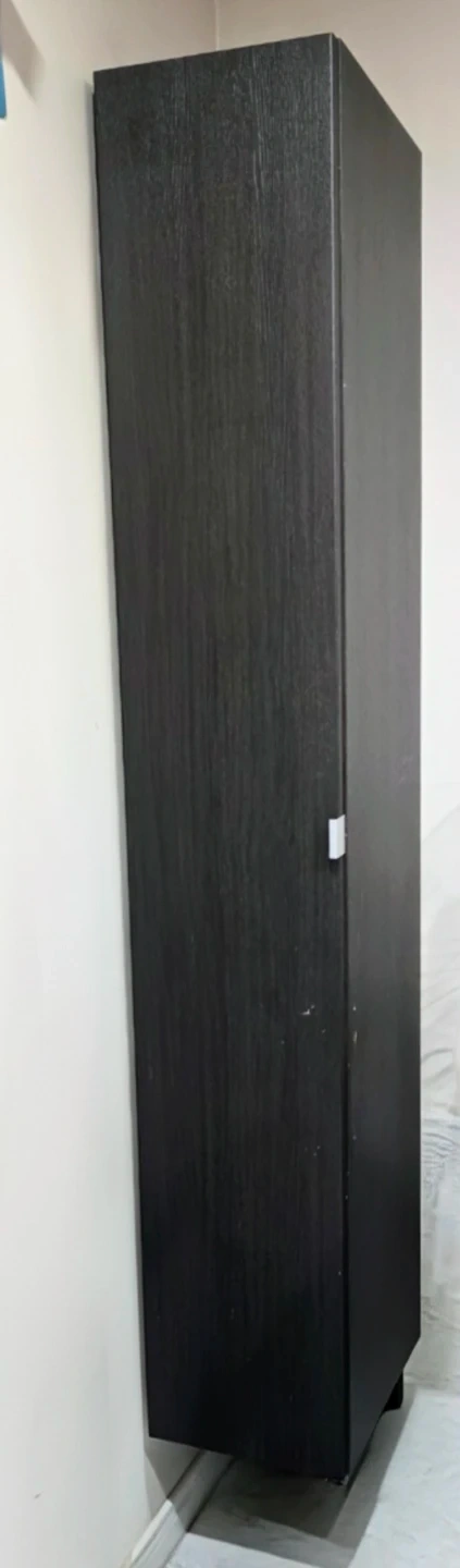 This is a tall, narrow storage cabinet with a black wood grain finish from Ikea. It features multiple shelves for organization. Dimensions: approximately 72 inches tall, 12 inches wide, and 15 inches deep. It's a versatile piece for any room needing extra storage space!