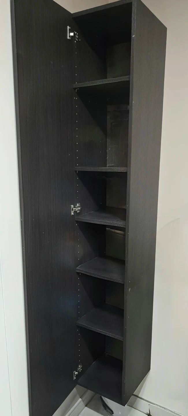 This is a tall, narrow storage cabinet with a black wood grain finish from Ikea. It features multiple shelves for organization. Dimensions: approximately 72 inches tall, 12 inches wide, and 15 inches deep. It's a versatile piece for any room needing extra storage space!