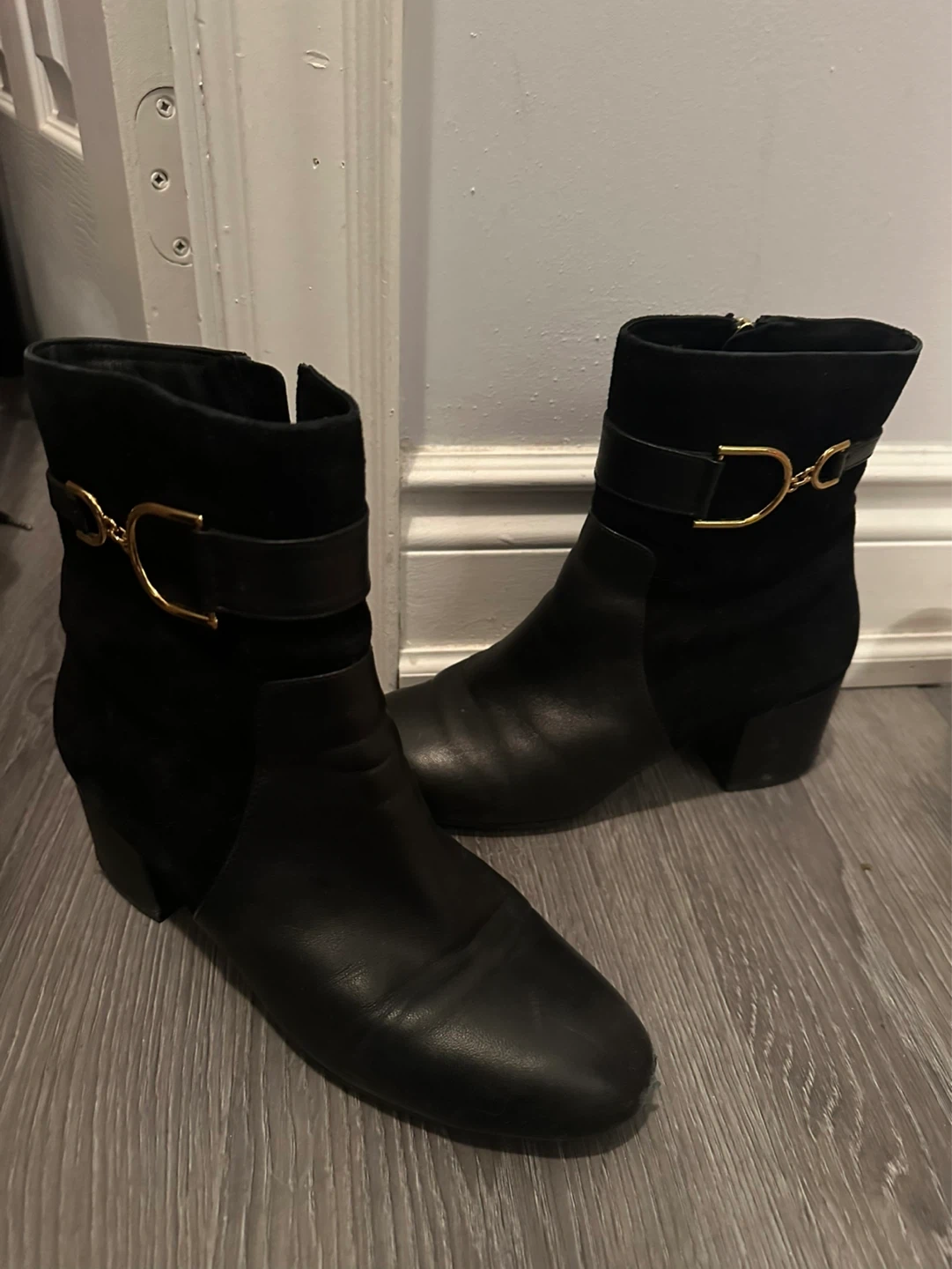 Stylish black ankle boots with a suede and leather upper. Features a decorative gold buckle detail and a side zipper for easy on and off. Block heel measures approximately 2 inches.