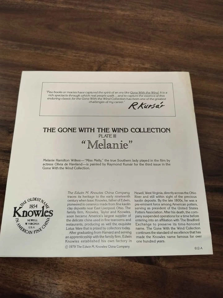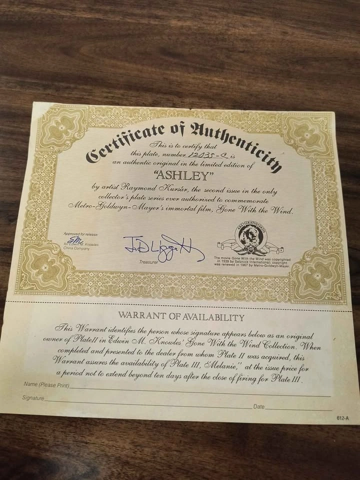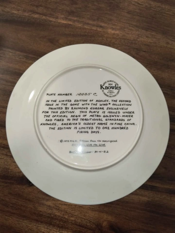Beautiful limited-edition “Ashley” collector plate from the Gone With The Wind Collection by Edwin M. Knowles (1979). Artwork by Raymond Kursar. Includes the Certificate of Authenticity and original paperwork.
