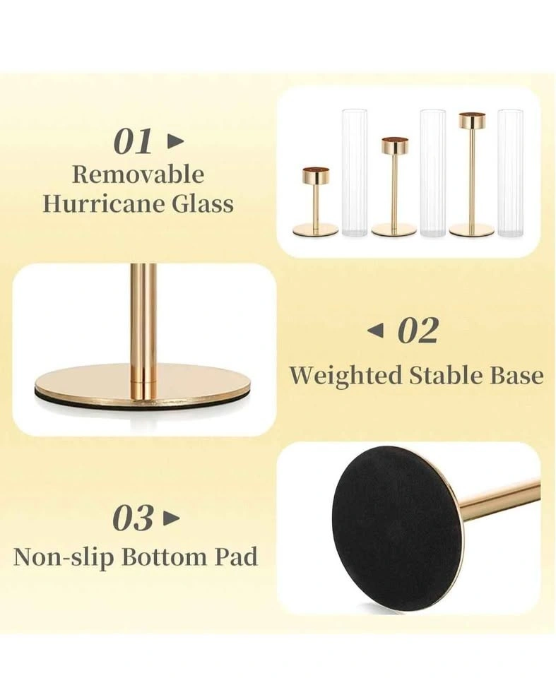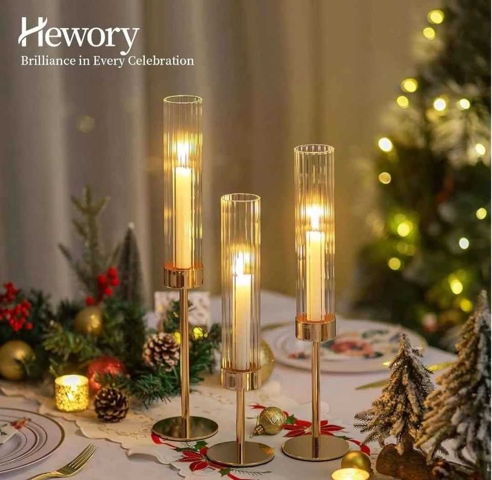 Hewory Gold Taper Candle Holders: Candlestick Holders Set of 3 Hurricane Glass Tall Candle Holder for Candlesticks Candle Sticks Holder Decor for Table Centerpiece Wedding Party Christmas Decorations.