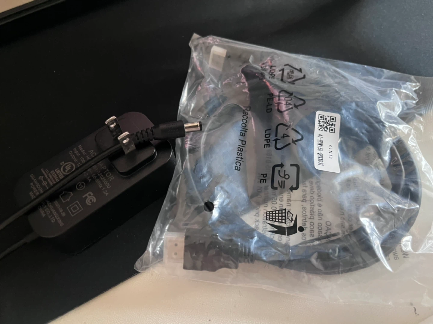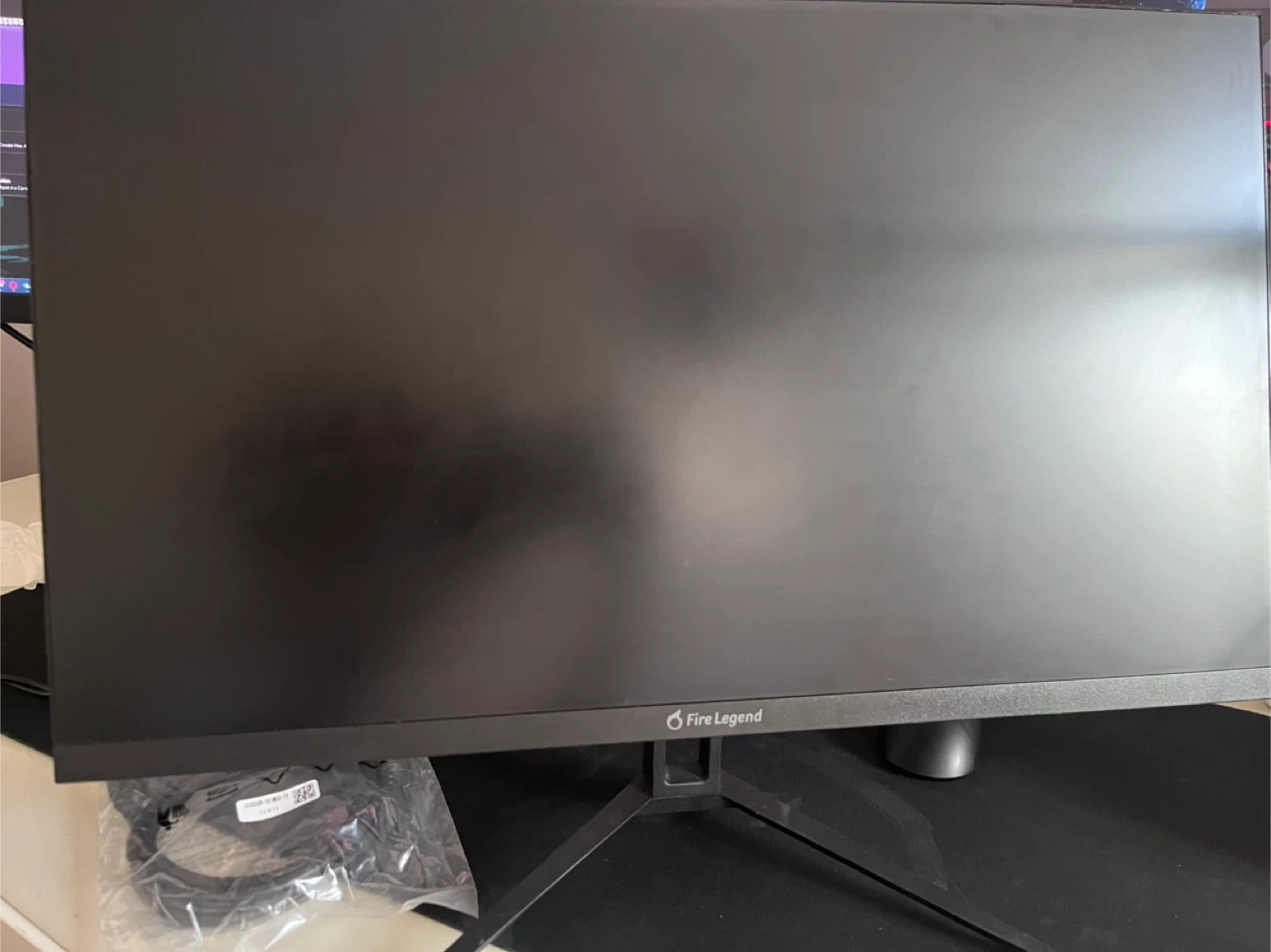 This is a Fire Legend monitor. It comes with a power adapter and an HDMI cable. The monitor has a sleek, modern design.