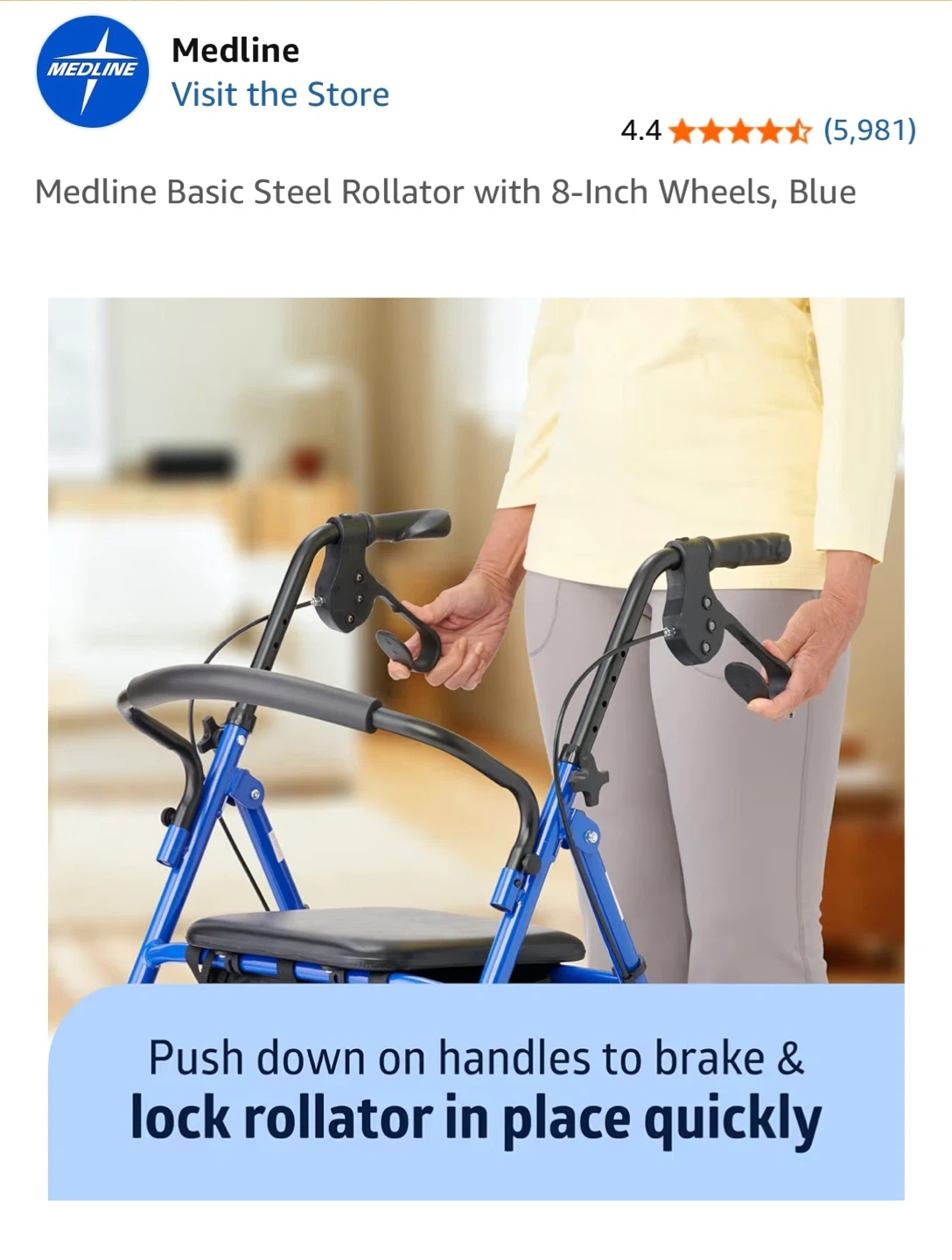 This Medline rollator walker features a teal steel frame and a comfortable seat with a removable storage bag. It's designed for dependable mobility support. The 8-inch wheels offer smooth rolling indoors and outdoors.