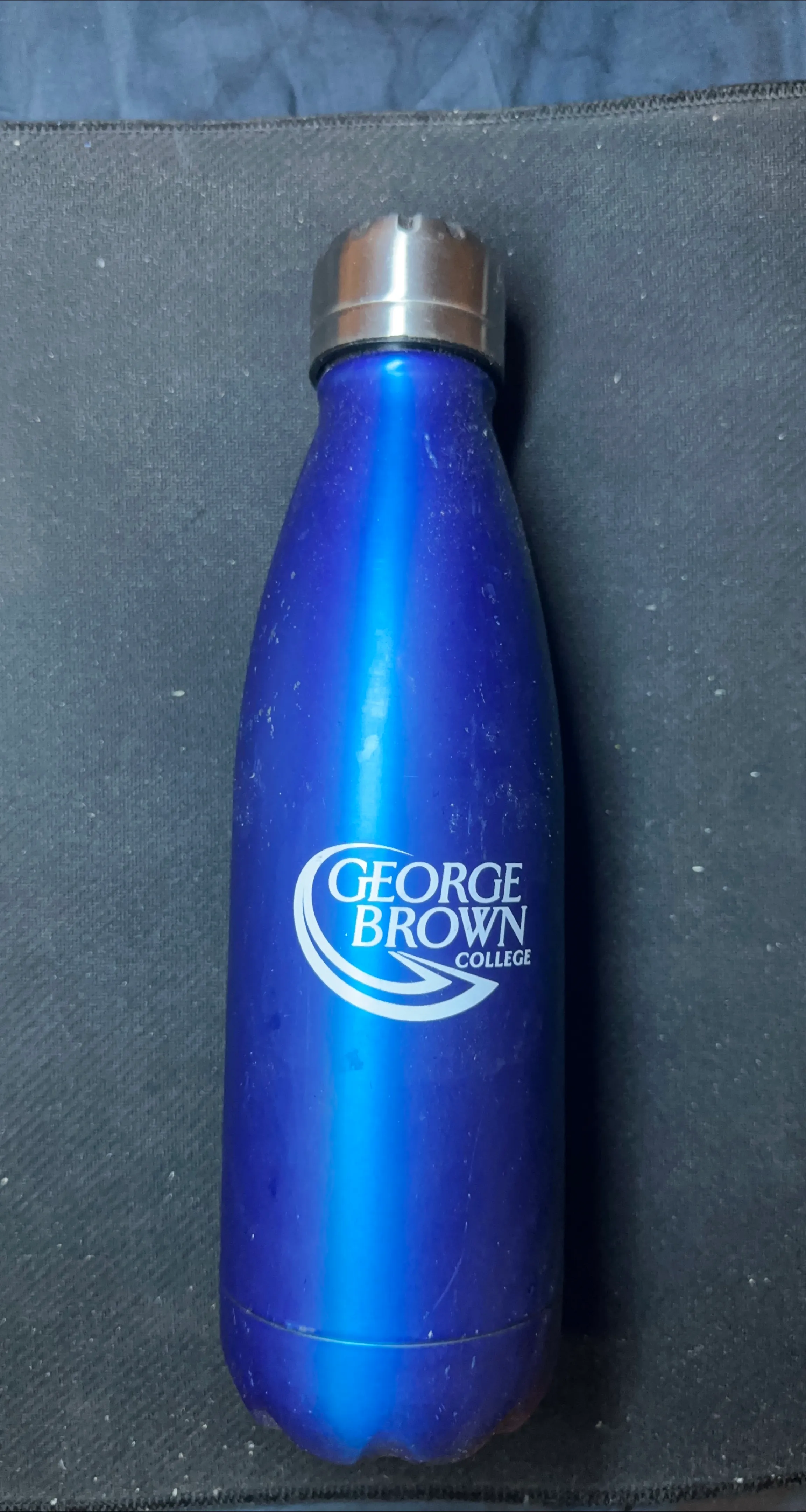 Selling a blue water bottle with the George Brown College logo.