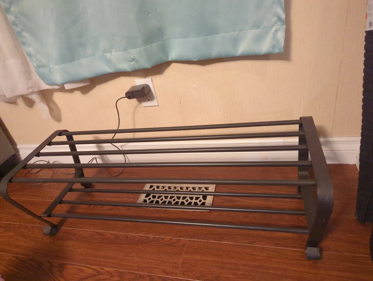 Ikea Portis metal shoe rack has two tiers.. It's a dark grey and pretty sturdy.