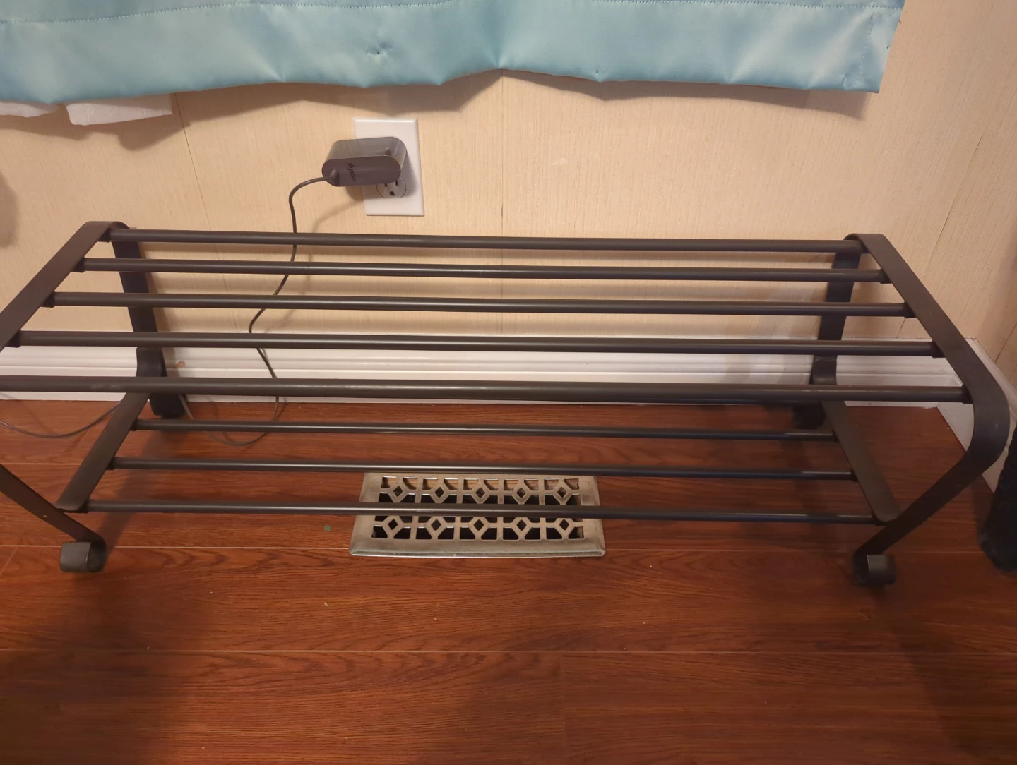 Ikea Portis metal shoe rack has two tiers.. It's a dark grey and pretty sturdy.